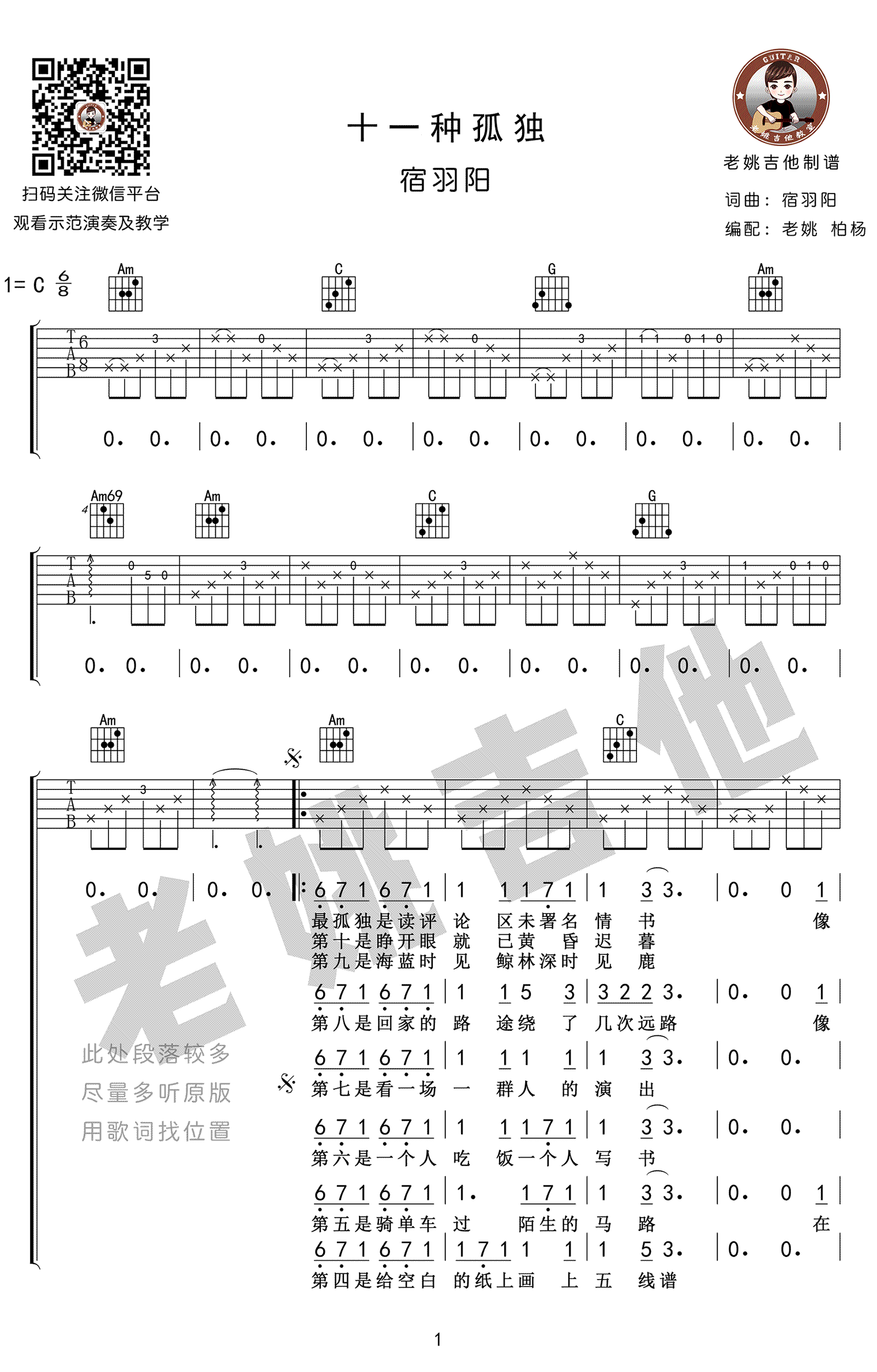 曲谱介绍: 十一种孤独吉他谱,宿羽阳演唱,一首忧伤的民谣歌曲,十一种孤独吉他弹唱谱,选用C调指法,高清图片谱由老姚编配,并提供吉他教学视频,琴谱网整理上传。 《十一种孤独》吉他视频教学: