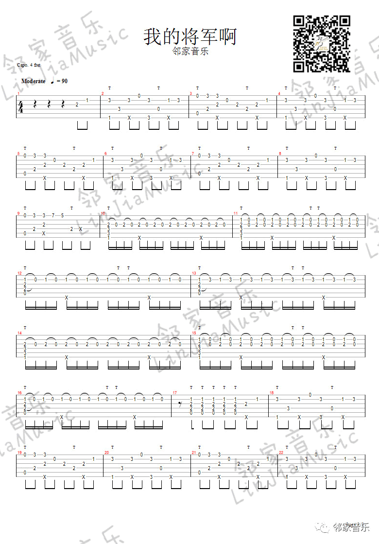 曲谱介绍: 我的将军啊指弹谱,半阳重新填词歌曲,一首热门抖音神曲,《我的将军啊》六线谱。二张高清图片谱,Capo夹4品,感谢邻家音乐的编配和提供视频演示,琴谱网收藏分享。这首古风歌曲在抖音上很是火爆,半阳那沙哑的声线真的很撩人,本曲谱改编成指弹吉他版本也别有韵味。人人心里都住着一个自己的江湖,那就跟着老师一起学弹起来吧。这个曲子整体的话就3个和弦 F G Am。 《我的将军啊》吉他指弹示范视频: