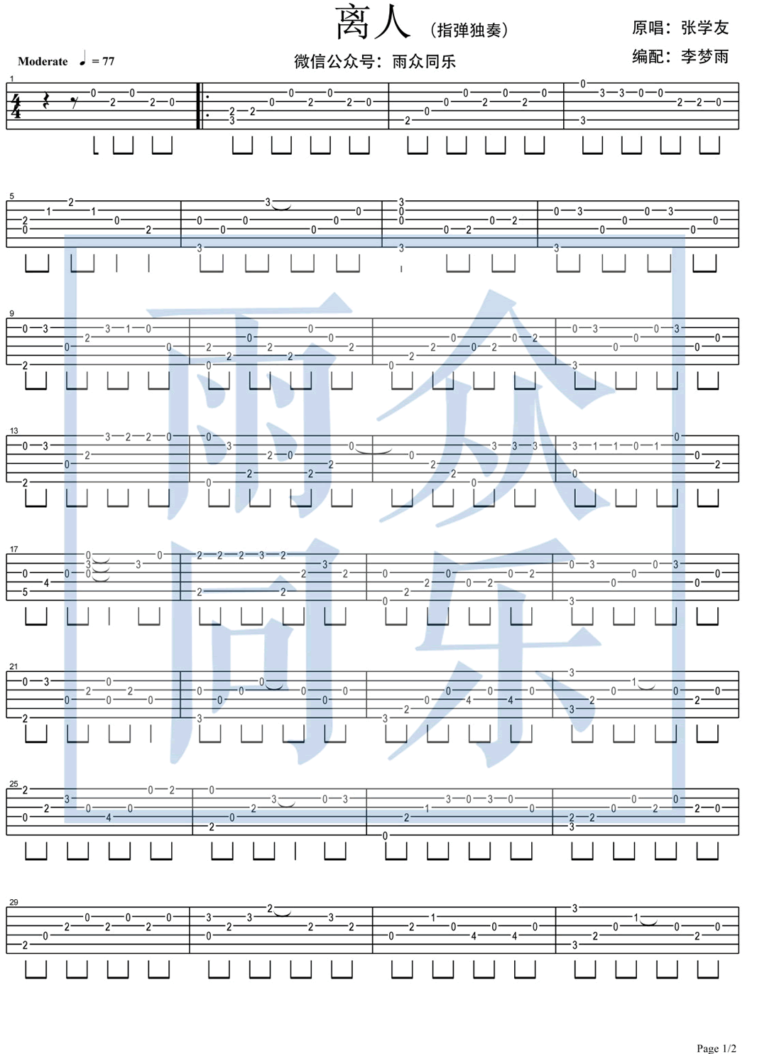 曲谱介绍: 离人指弹谱,张学友演唱,厉曼婷作词,何家文作曲,《离人》高清独奏谱,二张吉他六线谱,感谢雨众同乐的编配和提供,琴谱网每日更新,欢迎吉他爱好者收藏分享。 一首20年前的歌,放到今天来听,旋律依然是那么美,个人比较喜欢刘思涵翻唱的那个版本,抽了点时间做了这个指弹的谱子,可能很多年纪小的没听过,建议当新歌来听,耳朵会怀孕的哦。