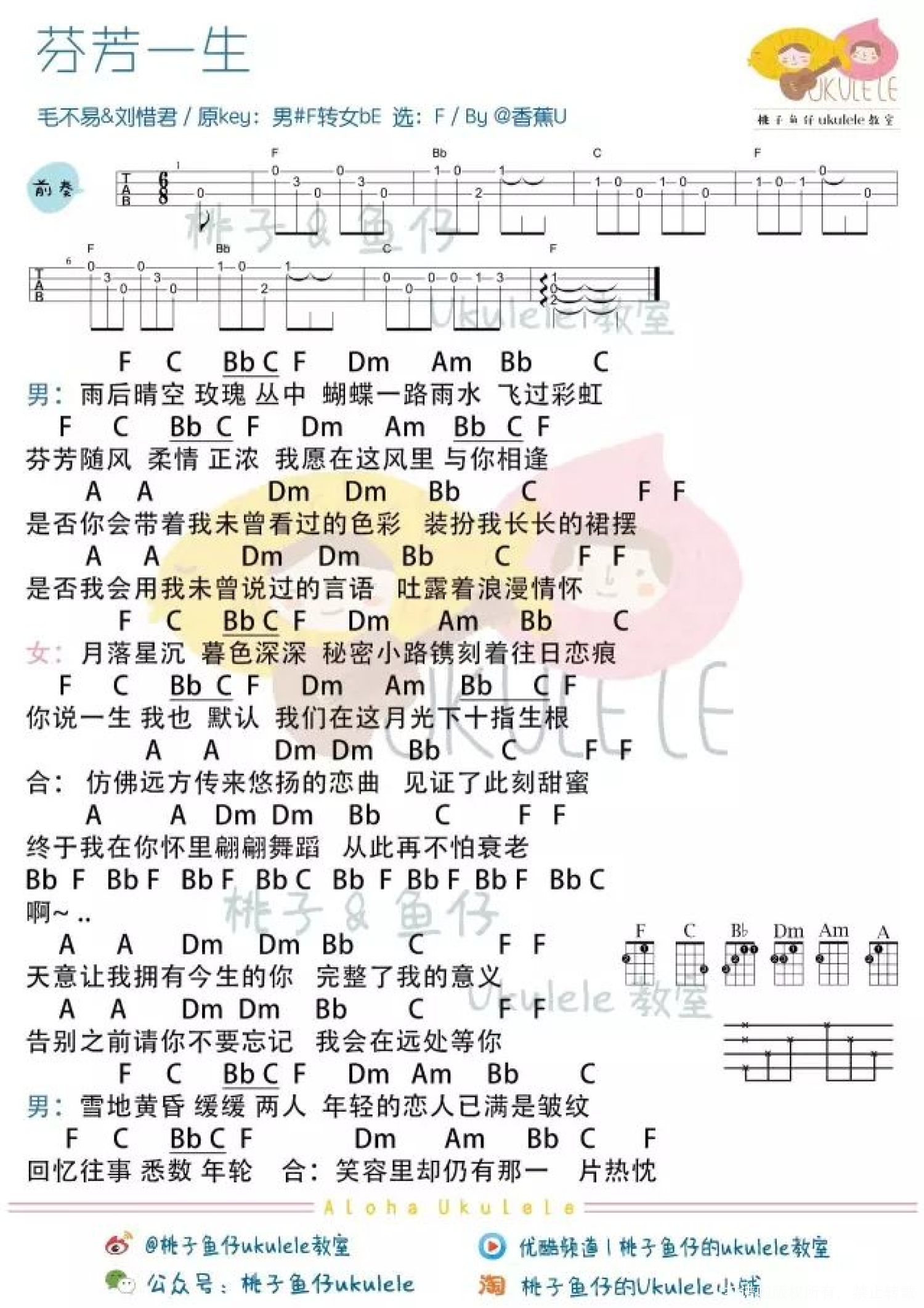 曲谱介绍: 唯美动听的情歌对唱,歌词写出了普通人的爱情模样,刘惜君声音清澈温婉,两人将这首歌的情感演绎到了极致~ 芬芳一生 尤克里里谱