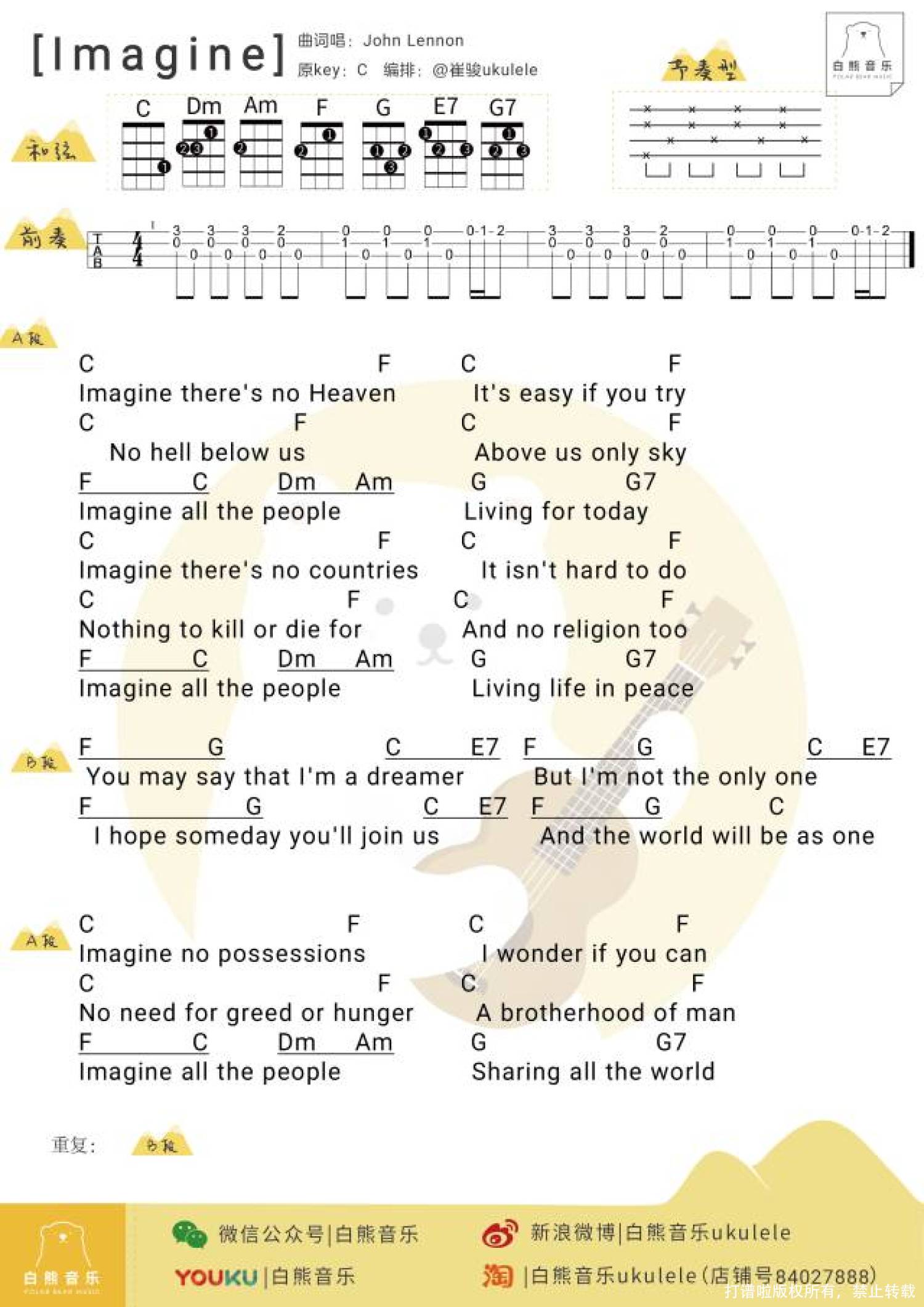 曲谱介绍: 〈Imagine〉 Info. “这首歌曲几乎是共产主义宣言式的,虽然我本人不是共产党员,也不属于任何运动……但是由于它披着一张流行的外衣,所以被大众接受了。我现在知道该怎么做了,只要抹上一点蜜糖,你的主张就可以容易地流传开来。” -John Lennon Imagine 尤克里里谱