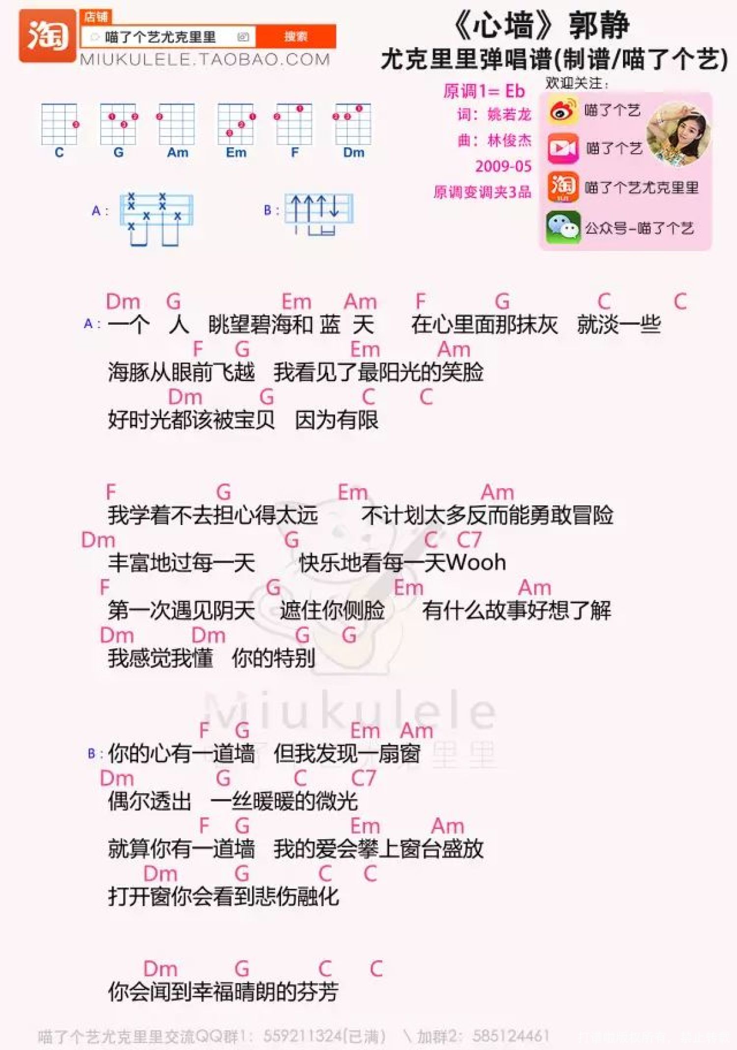 曲谱介绍: 心墙尤克里里演示+教学 Ukulele Cover 教学视频 曲谱