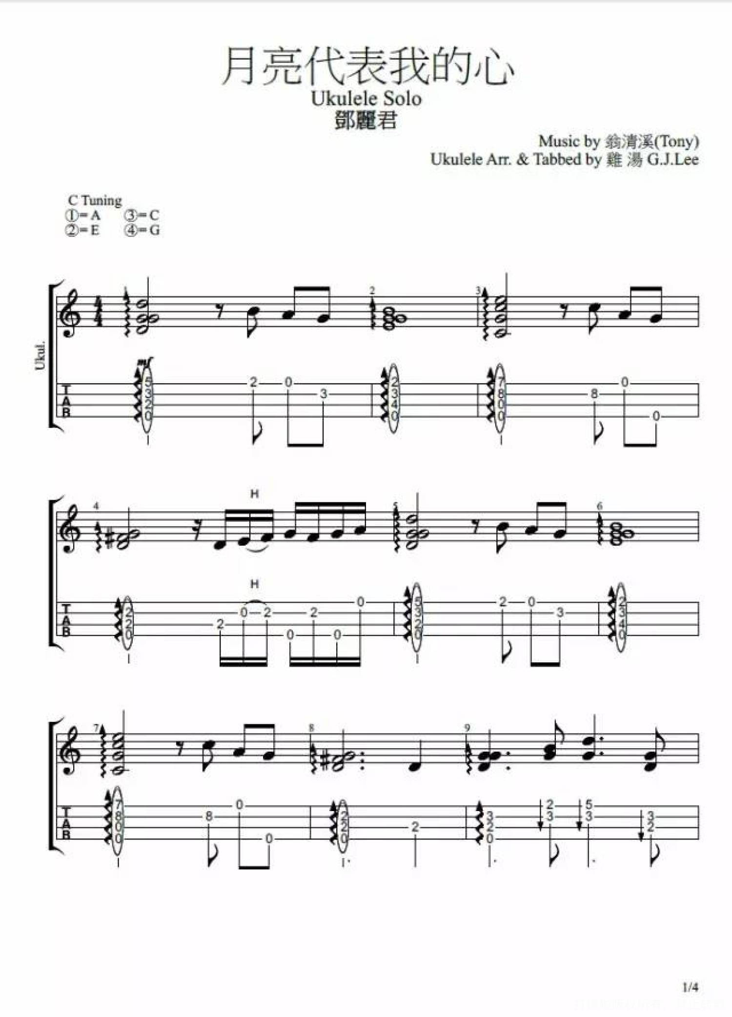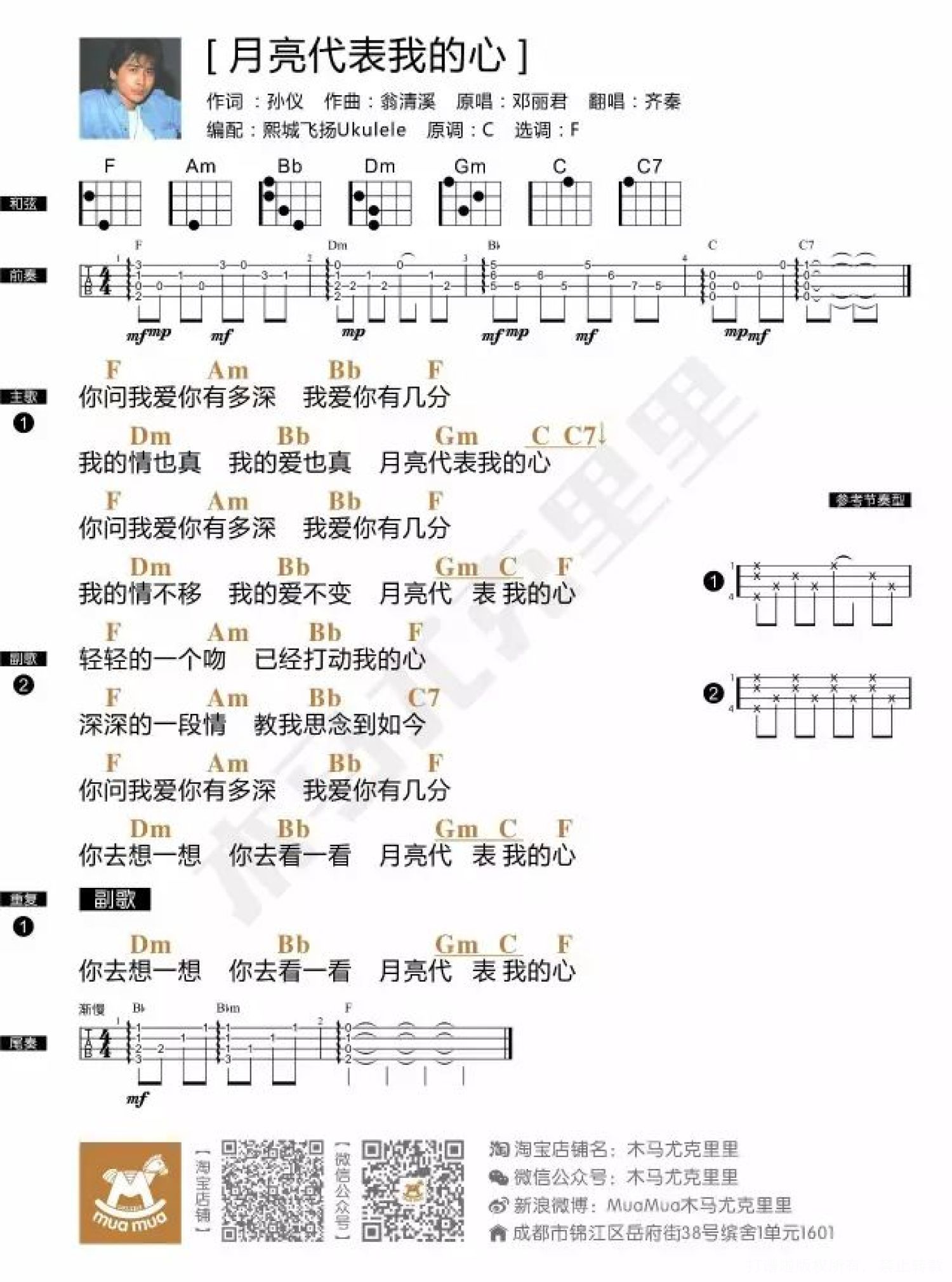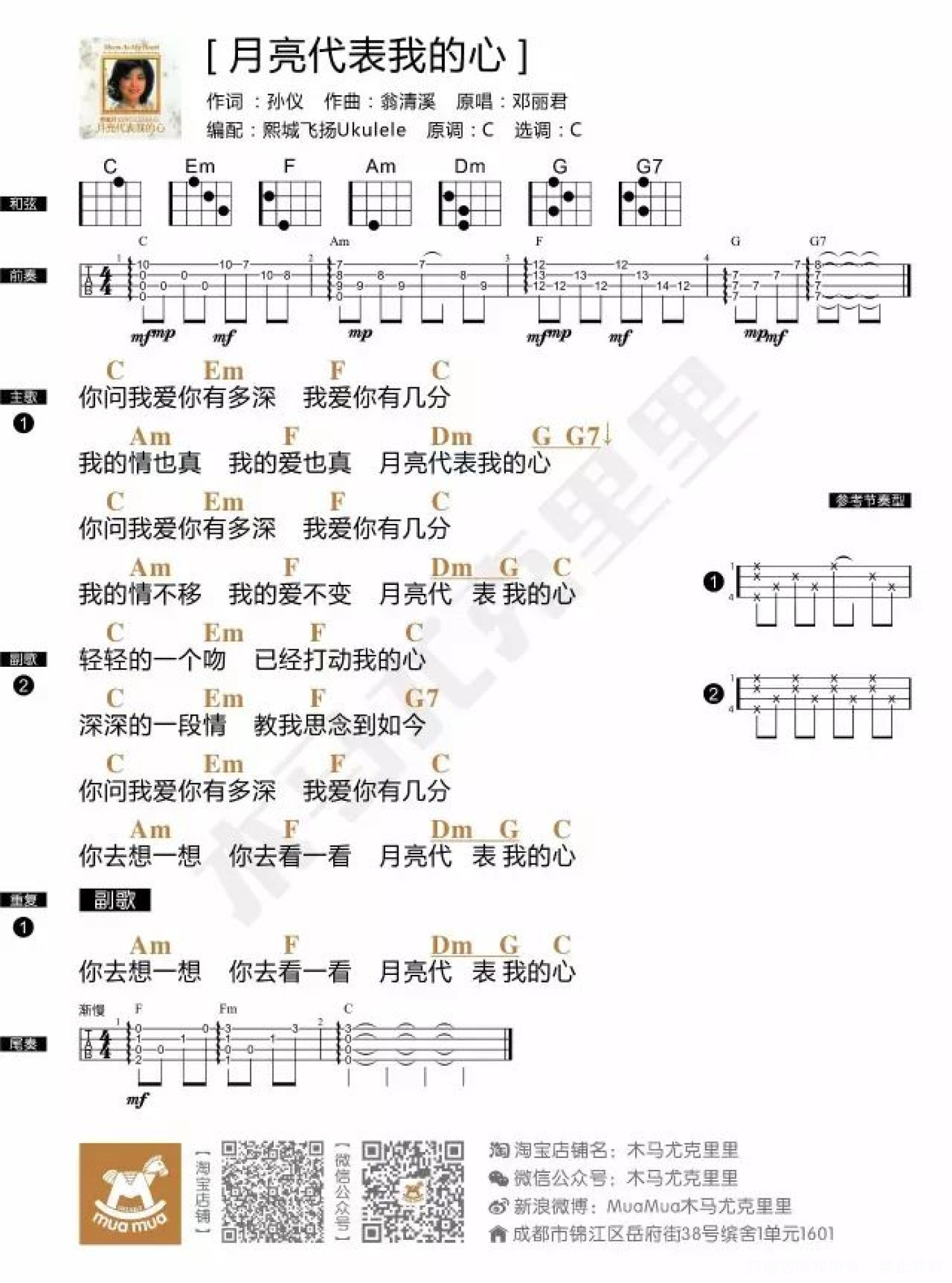 由于邓丽君小姐的版本过于经典,所以在尤克里里前奏的编排上,男女版曲谱都是用的邓丽君的版本。在尤克里里的音乐世界里,大家也热衷于演绎这首传世名曲,安详、宁静、温柔、细腻,娓娓道来感人心怀,用尤克里里表述衷肠。