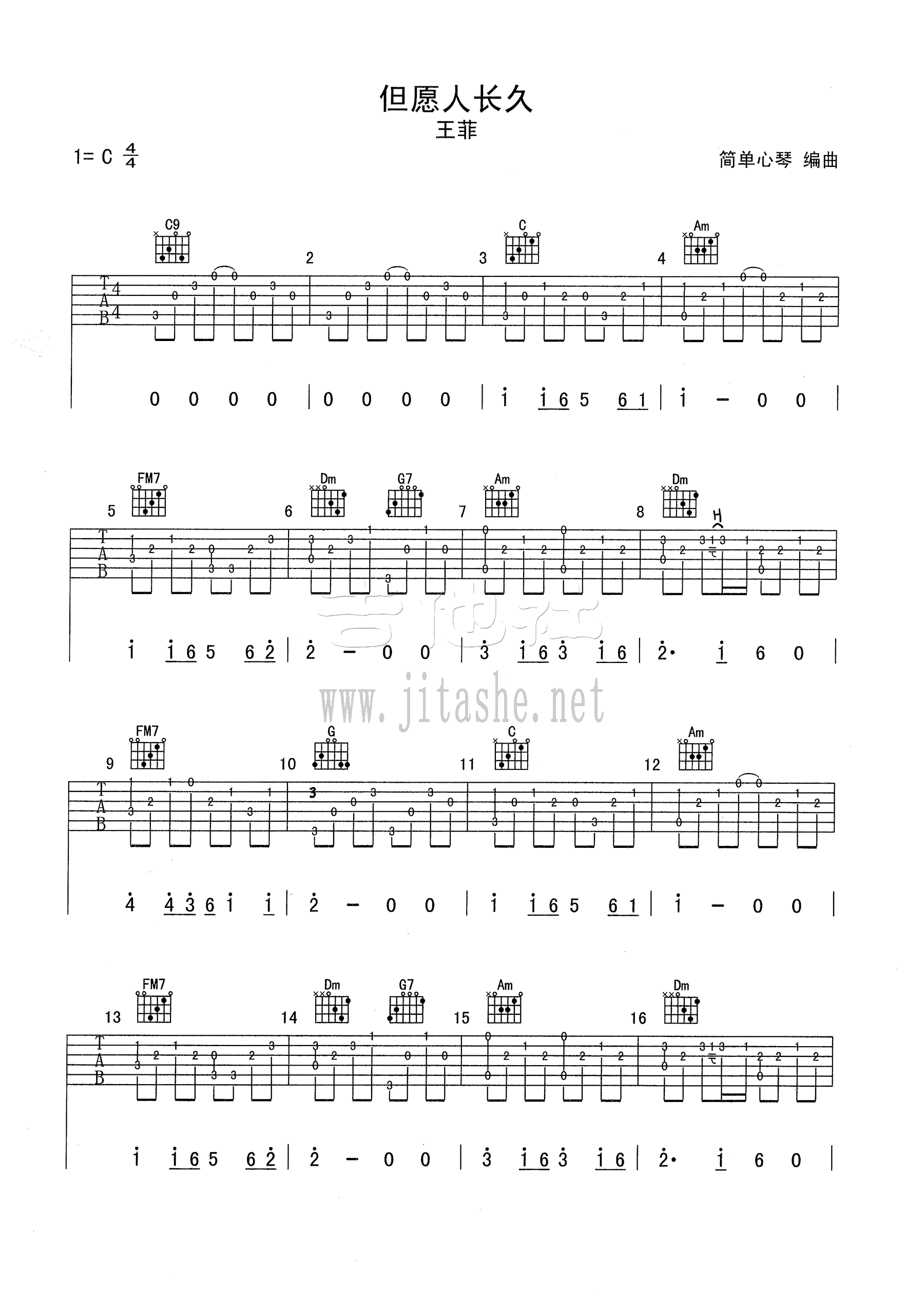 曲谱介绍: 但愿人长久指弹谱,王菲的一首怀旧歌曲《但愿人长久》吉他独奏谱,三张高清图片谱,选用C调指法,感谢简单心琴的编配和分享,琴谱网上传推荐。
