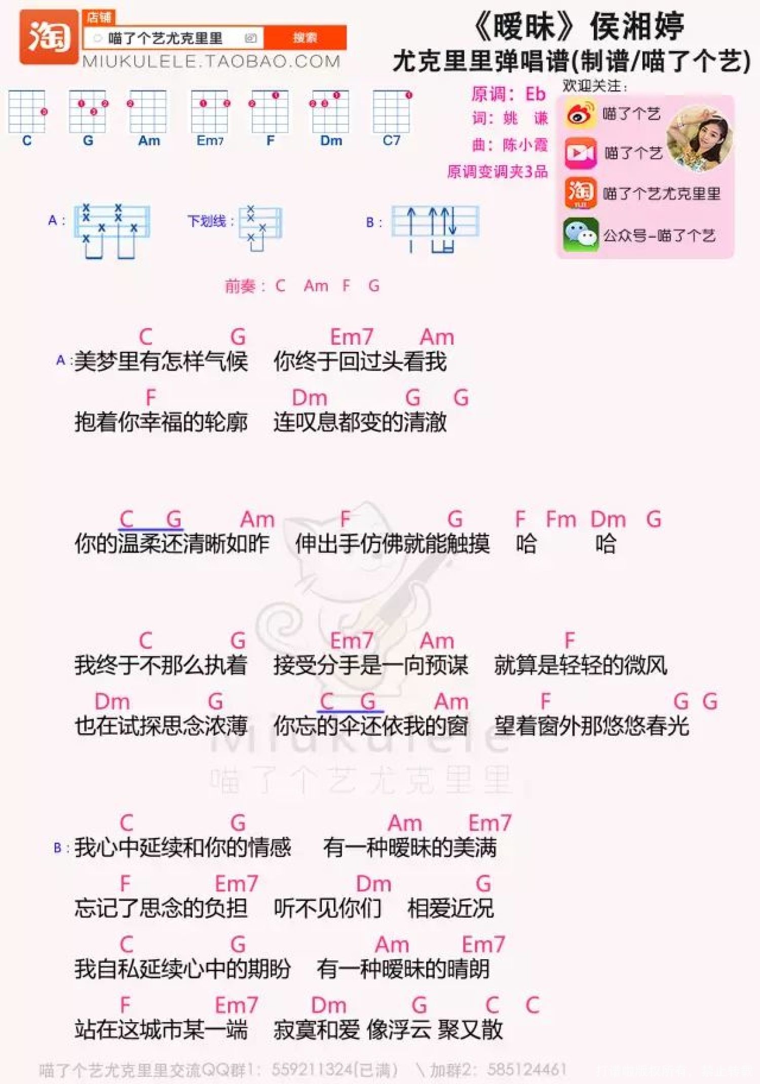 曲谱介绍: 暧昧 尤克里里 COVER 暧昧 曲谱