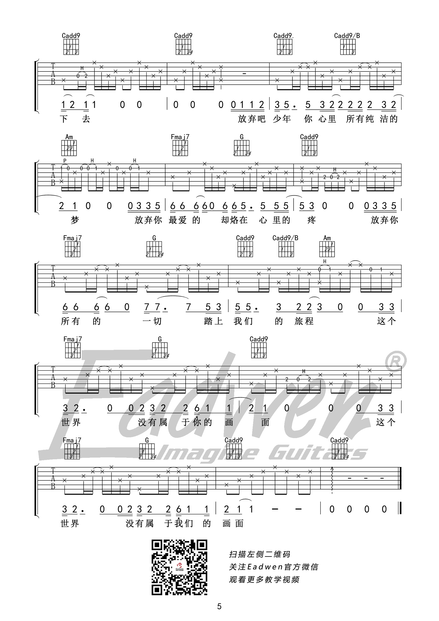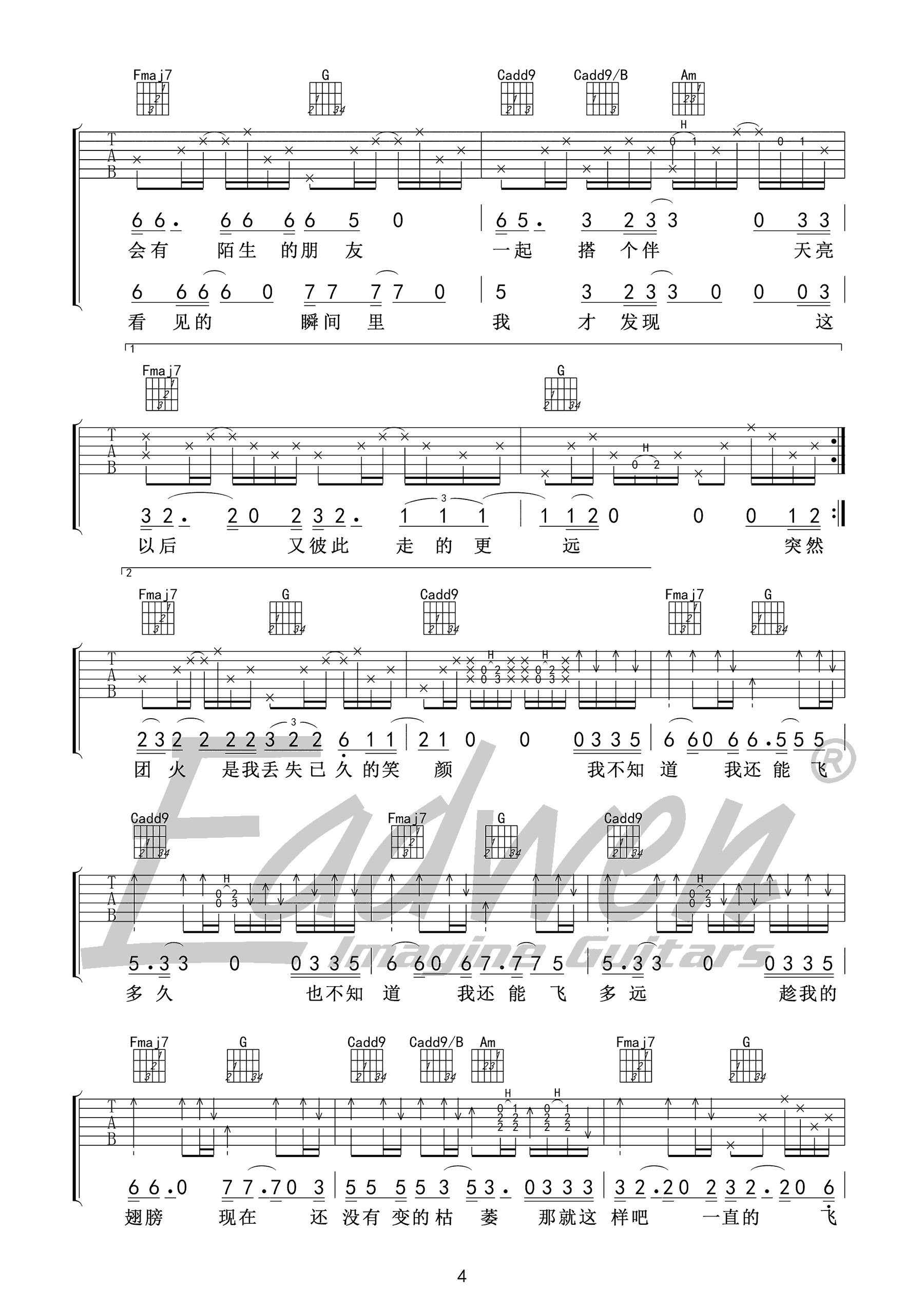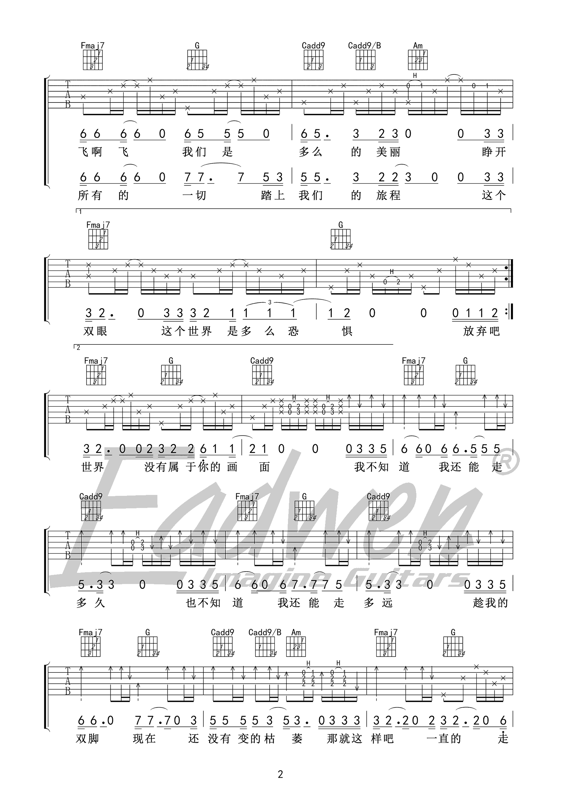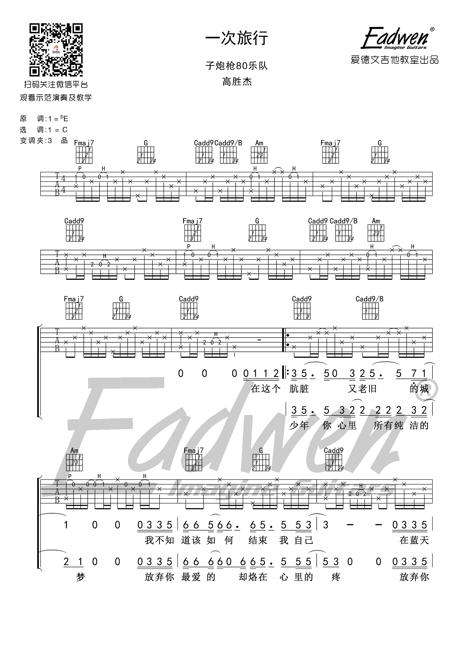曲谱介绍: 子炮枪80乐队演唱《一次旅行》吉他谱,五张图片谱,原调降E,选用C调指法,变调夹夹3品。感谢爱德文吉他的编配和提供的视频,琴谱网推荐分享。一支并没有什么知名度的乐队,但却备受青睐,这首一次旅行打动许多人的心,让那些无法诉说的感受在歌声中相遇相知陪我们一直走下去。