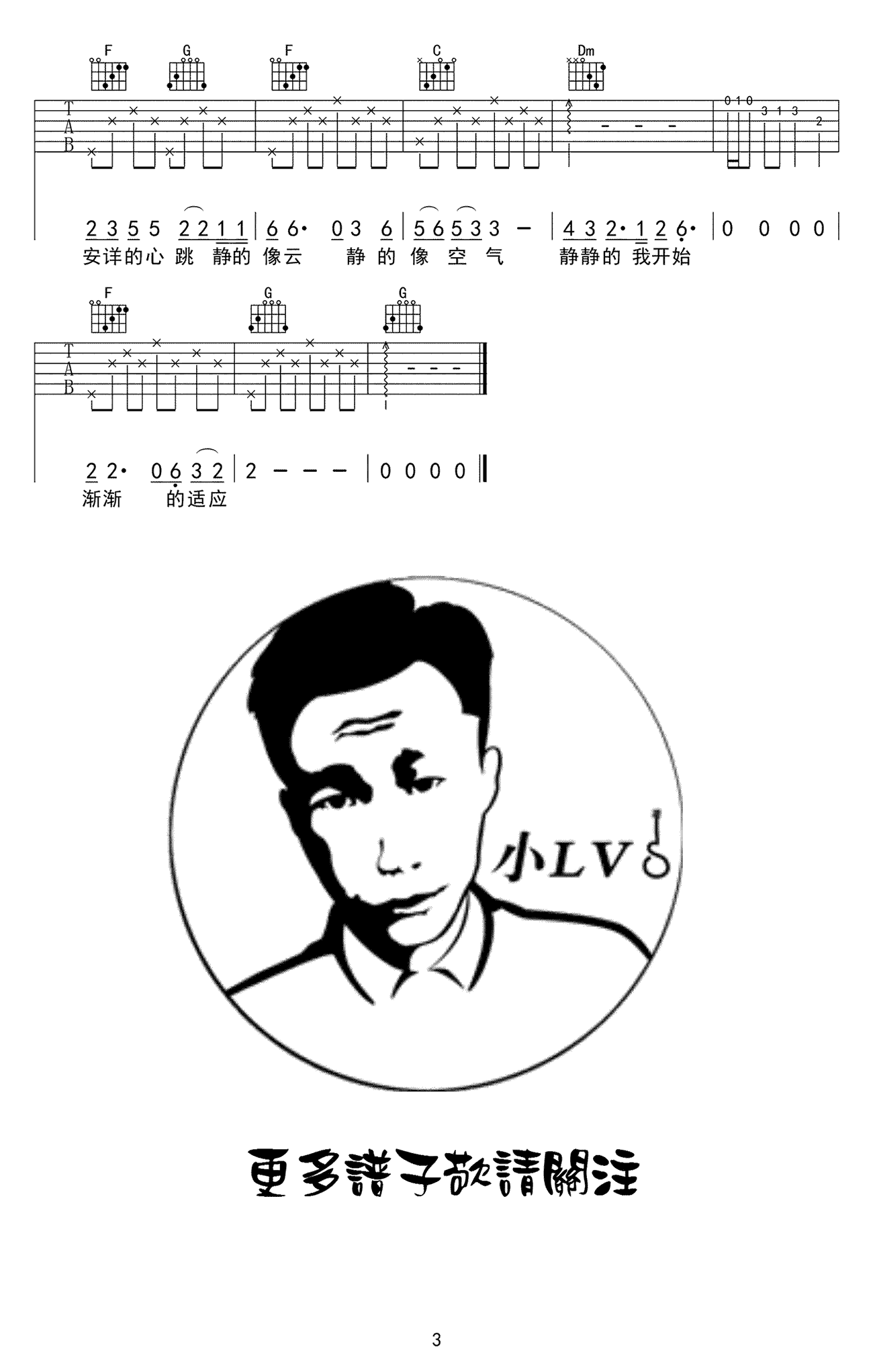 曲谱介绍: 静下来吉他谱,赵雷老歌新编,大乔小乔原唱调《静下来》六线谱,选用C调指法,变调夹夹2品,三张图片谱,感谢小V老师的编配和提供的弹唱演示和教学,琴谱网推荐分享。身处在喧闹的都市中想要获得一片宁静是很难获得的,你想要静下来不如从这首歌开始。跟着老师一起学起来吧。