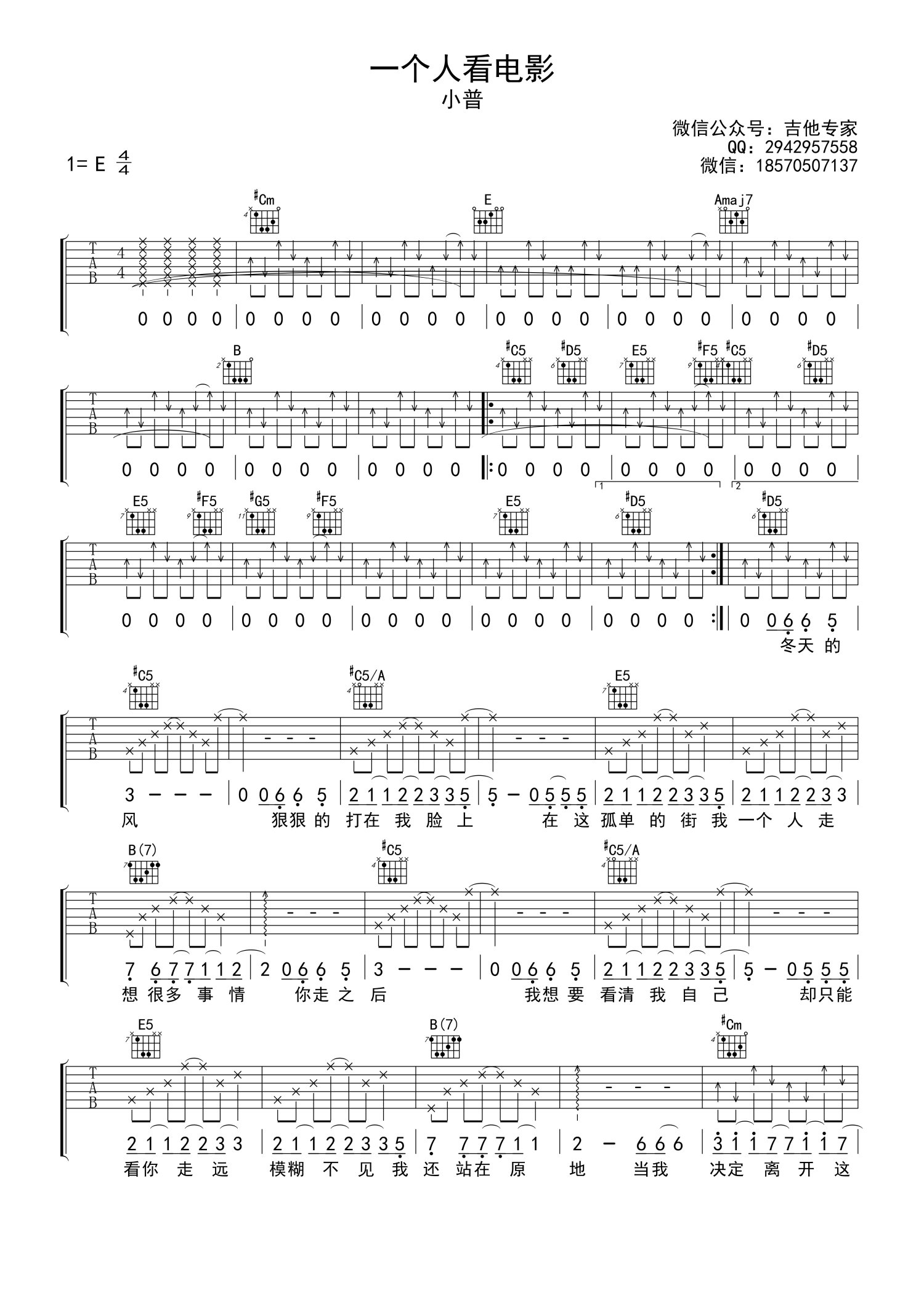 • 一个人看电影吉他谱 - 小普 - C调吉他弹唱谱 - 扫弦版第1张