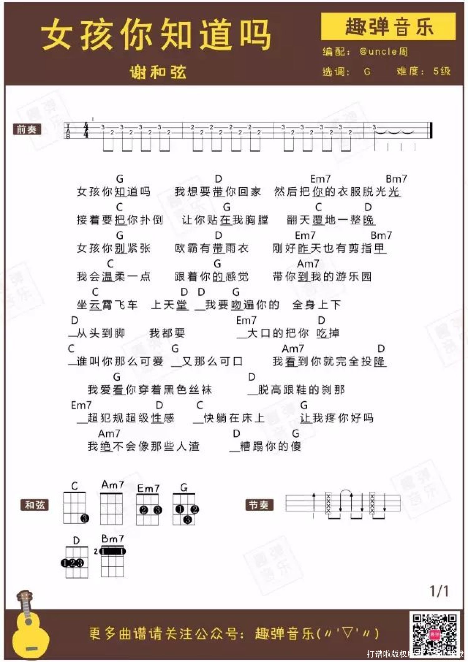 曲谱介绍: 女孩你知道吗 马叔叔翻唱MV emmm一上来就这么污真的好吗?灰子也很绝望呀~但是很多小伙伴点名这首歌,大概是大家都长大了吧……(望天ing) 如果你能听懂歌词,恭喜你已经是个大人了(〃'▽'〃)这样又污又直白得可爱的一首歌,竟有不少朋友表示是被妹子推荐来听的…… 这首歌来自台湾歌手谢和弦,他同时还是一名演员,出演过电影<终极一家>。 虽然外表看上去特立独行,但谢和弦是一个有想法有才能的创作者。“生活不过是生存与活着,保持真实。”他自嘲只有一把木吉他支持着他,但歌迷在他的简单直白的音乐里找到了感动。 曲谱