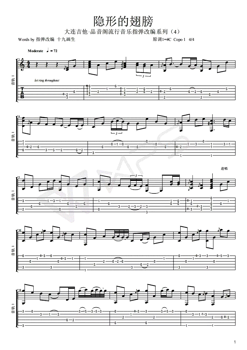 曲谱介绍: 张韶涵《隐形的翅膀》指弹吉他谱,吉他独奏指弹谱,四张图片谱,原调#C,capo:1品,感谢品音阁的编配和提供,琴谱网推荐分享。这首歌曲采用的和弦非常丰富,整曲演奏要达到非常流畅的程度,的确有一定难度,需要勤加练习。(注明:为了方便一些不熟悉反复记号的琴友,我们谱表采用无循环式的记录方法)。附上演奏视频: