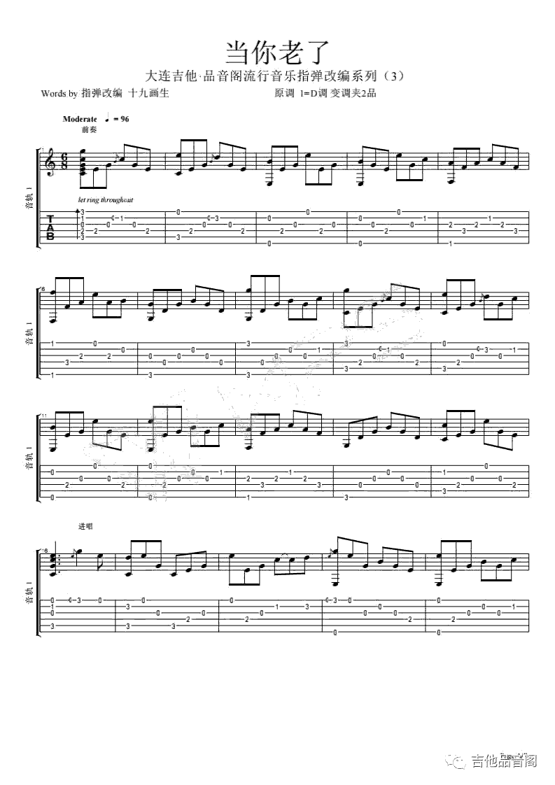 曲谱介绍: 当你老了指弹吉他谱,赵照作曲,歌词改编自爱尔兰诗人叶芝的诗歌《When You Are Old》,当你老了吉他独奏谱,共七张图片谱,感谢品音阁的编配,琴谱网推荐分享。特别提示大家的是,编曲者『十九画生』依然延续了尊重原著的改编风格,原曲1=D调(标准弦夹二品)。版主的演绎委婉动听,娓娓道来,像是在诉说着我们渐渐老去的故事。有喜欢的琴友可以对照下列谱子和演奏视频一起学习,之后可以跟着原版歌曲一起演奏。(注明:为了方便一些不熟悉反复记号的琴友,我们谱表采用无循环式的记录方法)