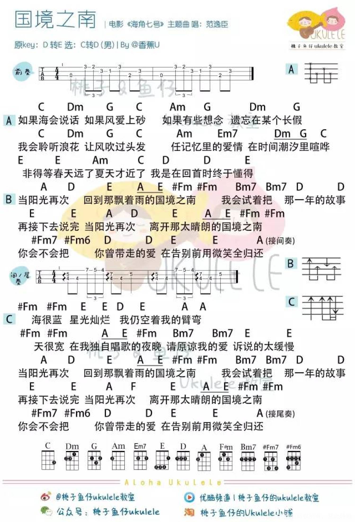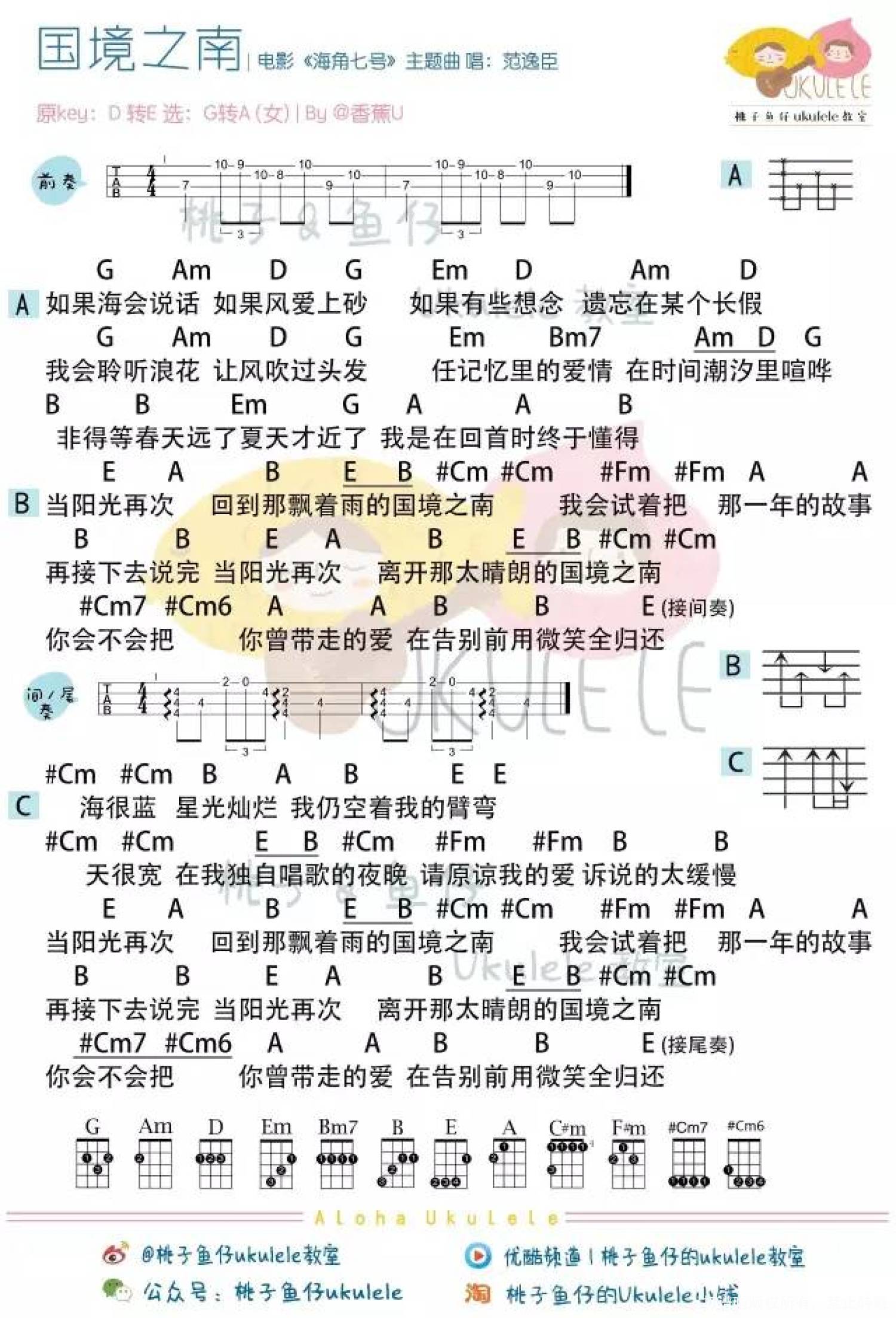 曲谱介绍: 即使没有被世界温柔以待,也要怀着勇气继续生活。 《海角七号》里的每一个人,都有一个简单而执着的梦想。 蓝天,大海,慢节奏生活的村民,还有各种各样的小人物... 阿嘉爱音乐,却又被难以实现音乐梦想的愤怒支配,颓然生活;友子是模特,渴望在镜头前施展、却又被公司抛弃,留在台湾打杂;茂伯年老固执,摔伤了不能送信,却有一个不拿贝斯拿月琴唱属于自己那个年代的慢歌的情怀。 电影里的每个人都有自己的故事,都有一颗阅尽世间心酸需要温暖抚慰的灵魂。 影片中一个感人的地方,是它六十年的时间跨度。六十年可以改变很多,它可以使台湾的面貌发生翻天覆地的变化,它可以让两个相爱的人无法天长地久。电影里穿插的日本男中音的叙述婉婉而来,诉说的是六十年前被战争湮灭的悲伤:泛黄的信件,丢失的地址和再也回不去的爱情。 在《海角七号》里,每个人总能找到你喜欢的故事。有人为爱情感动,有人为小人物喝彩,有人为音乐疯狂。你有怎样的眼睛,就可以看到怎样的海角七号。 国境之南 Ukulele Cover  教 学 & 曲谱 国境之南 尤克里里谱 女声版 男声版