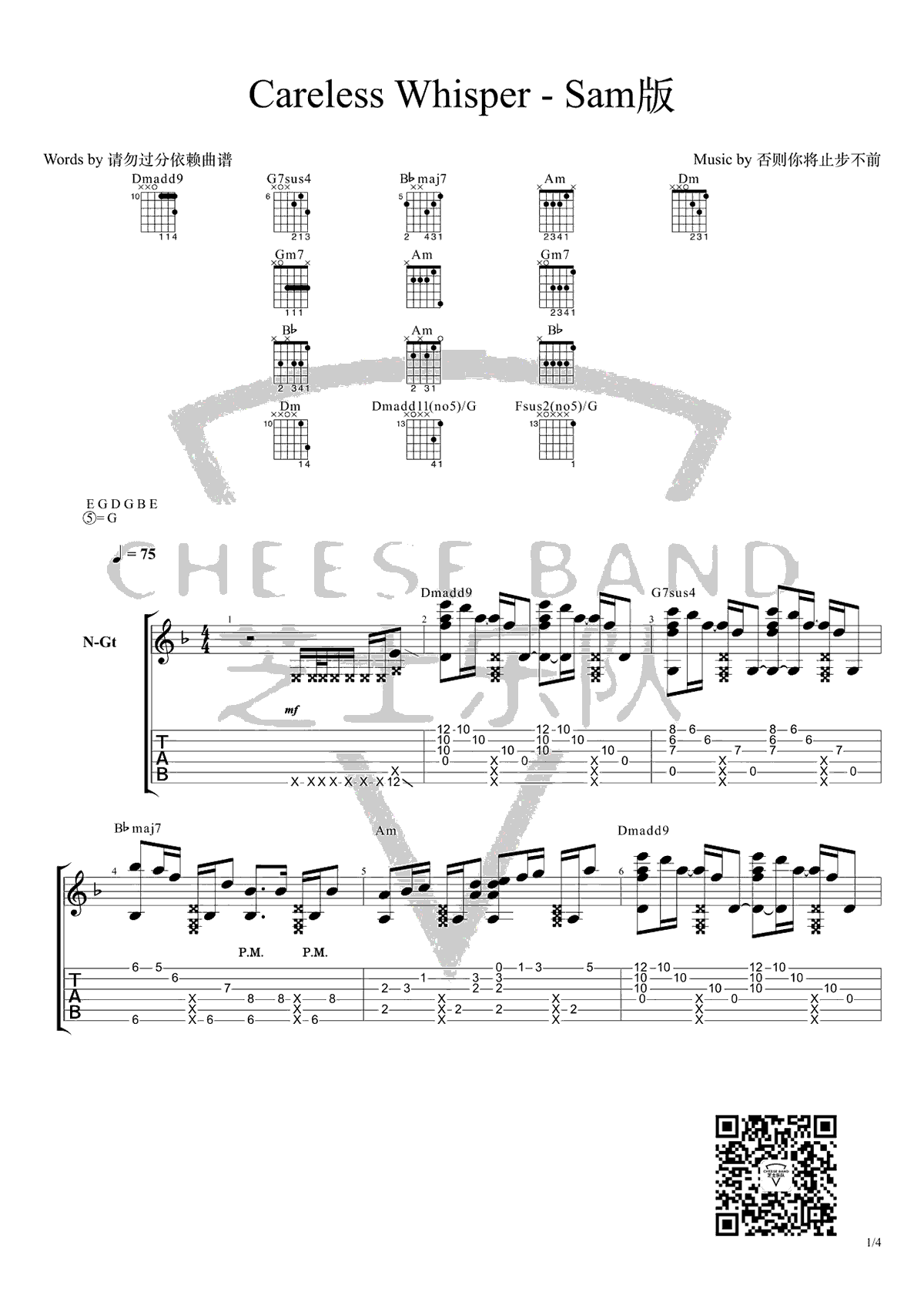 曲谱介绍: Careless Whisper指弹吉他谱,Careless Whisper吉他独奏六线谱,四张图片谱,威猛乐队(Wham)的一首经典英文歌曲改编,感谢李森茂Sam的编配和提供,琴谱网每日更新,欢迎收藏分享。秒被前奏附吸的歌曲,多么抒情,多么温柔,好听到不能停,百听不厌,永远的经典。笔芯。