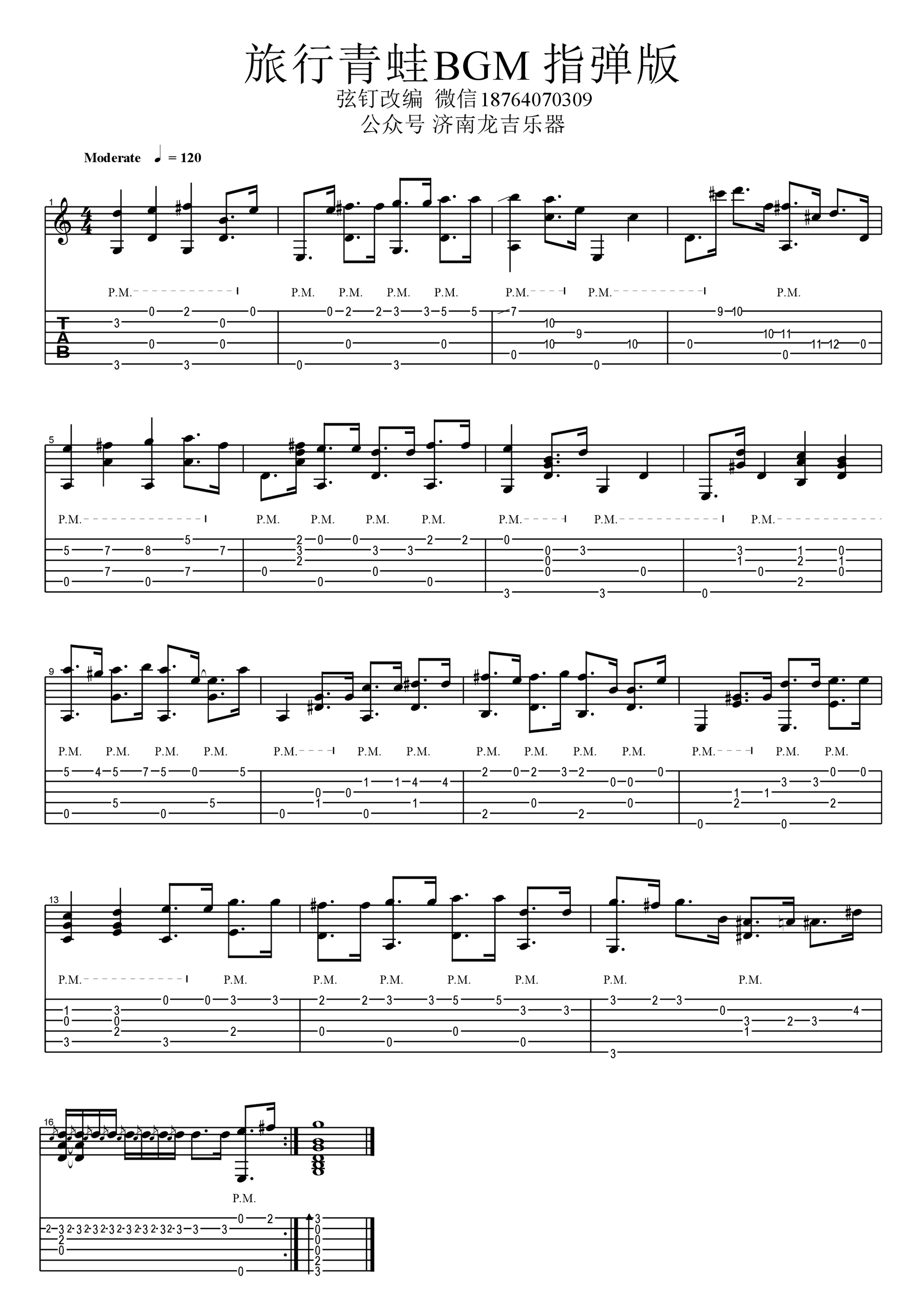 曲谱介绍: 旅行青蛙指弹吉他谱,风靡一时的休闲小游戏,《旅行青蛙》BGM吉他独奏谱,图片谱高清版,感谢弦钉编配和,琴谱网上传更新,欢迎吉他爱好者收藏分享。本曲谱使用boom chick进行编曲,尽量还原原曲的欢快跳跃的曲风,G调指法相对不难,同学们可以右手拇指佩戴指套进行演奏,附上配套示范方便大家参考练习。旅行青蛙指弹吉他视频演示: