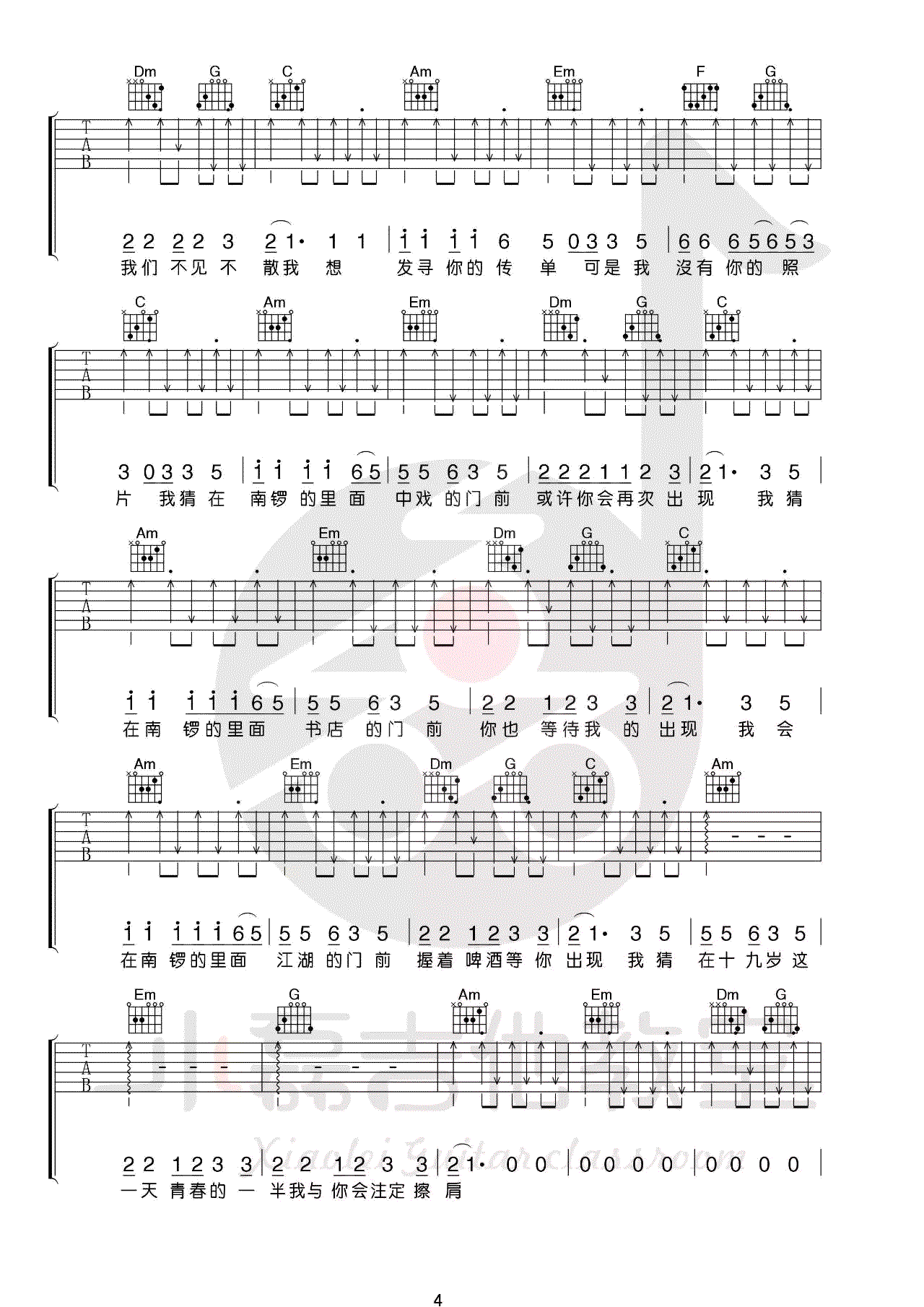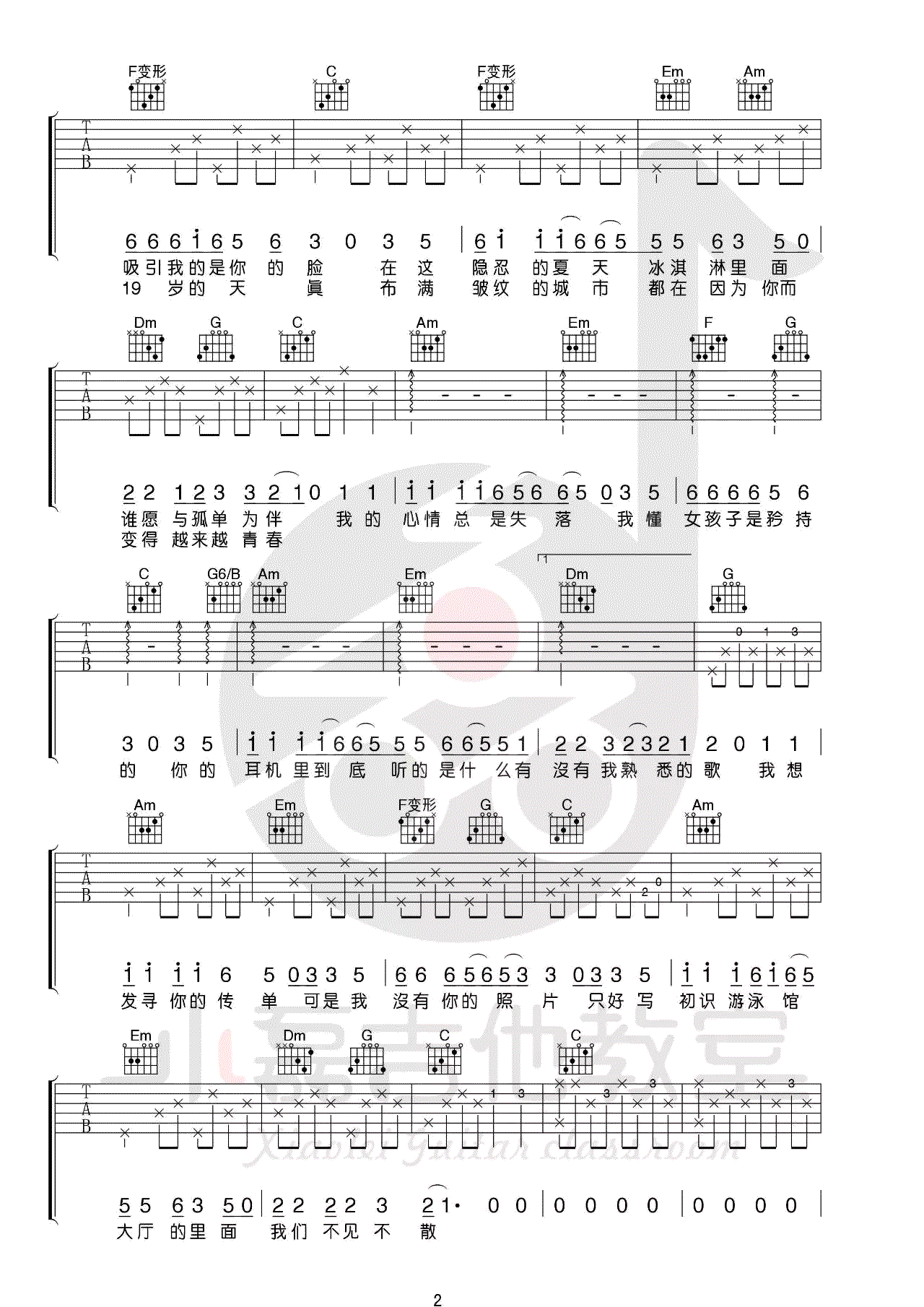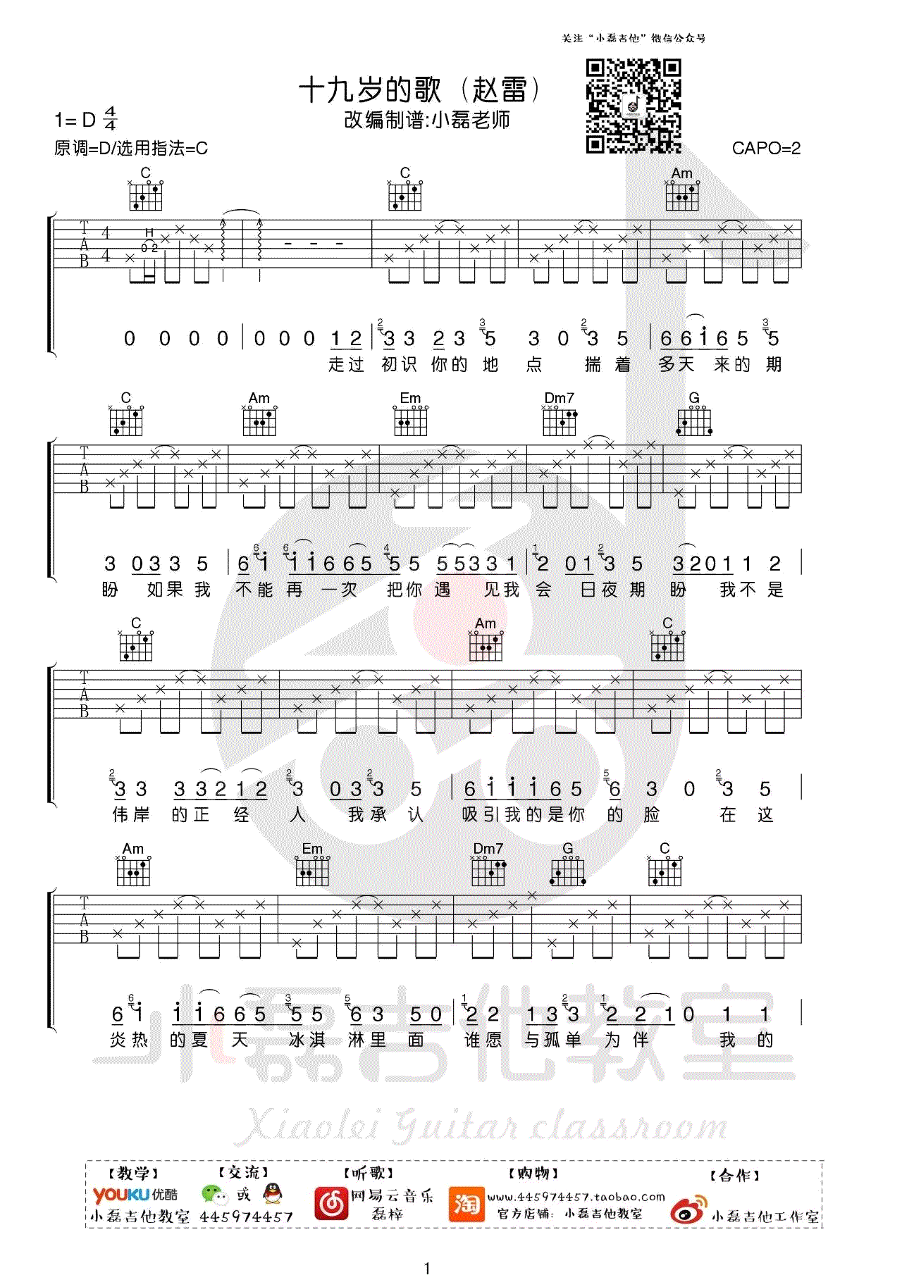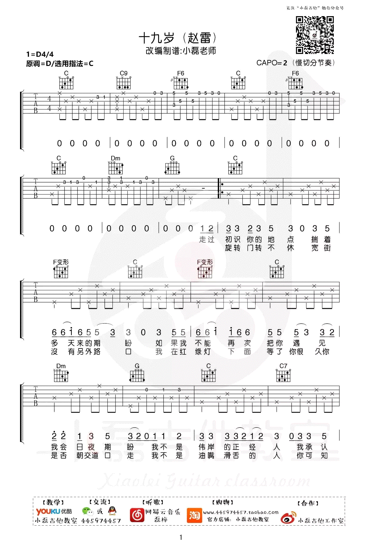 曲谱介绍: 赵雷演唱《十九岁》吉他谱,新版+旧版吉他图片谱,十九岁六线谱,原调D,选用C调,Capo:2品,慢切分节奏。感谢小磊老师的编配,弹唱演示和提供的视频讲解,琴谱网推荐分享。 小磊老师说,这首赵雷的《十九岁》讲述的是他的一次貌似邂逅偶遇的经历,不管是什么,好听是必须的,在2017年五月,我曾经做过这首歌的教学,因为当时还没有正式发布这首录音版本,只是参照赵雷的一小段现场版本改编的乐谱,所以略微的粗糙,但是我还是改编了间奏,当时受到了大家的好评,今天我就分享两个版本的乐谱给大家学习参考。老规矩,先看教学视频,再看乐谱!赵雷《十九岁》吉他弹唱教学视频: 新版本