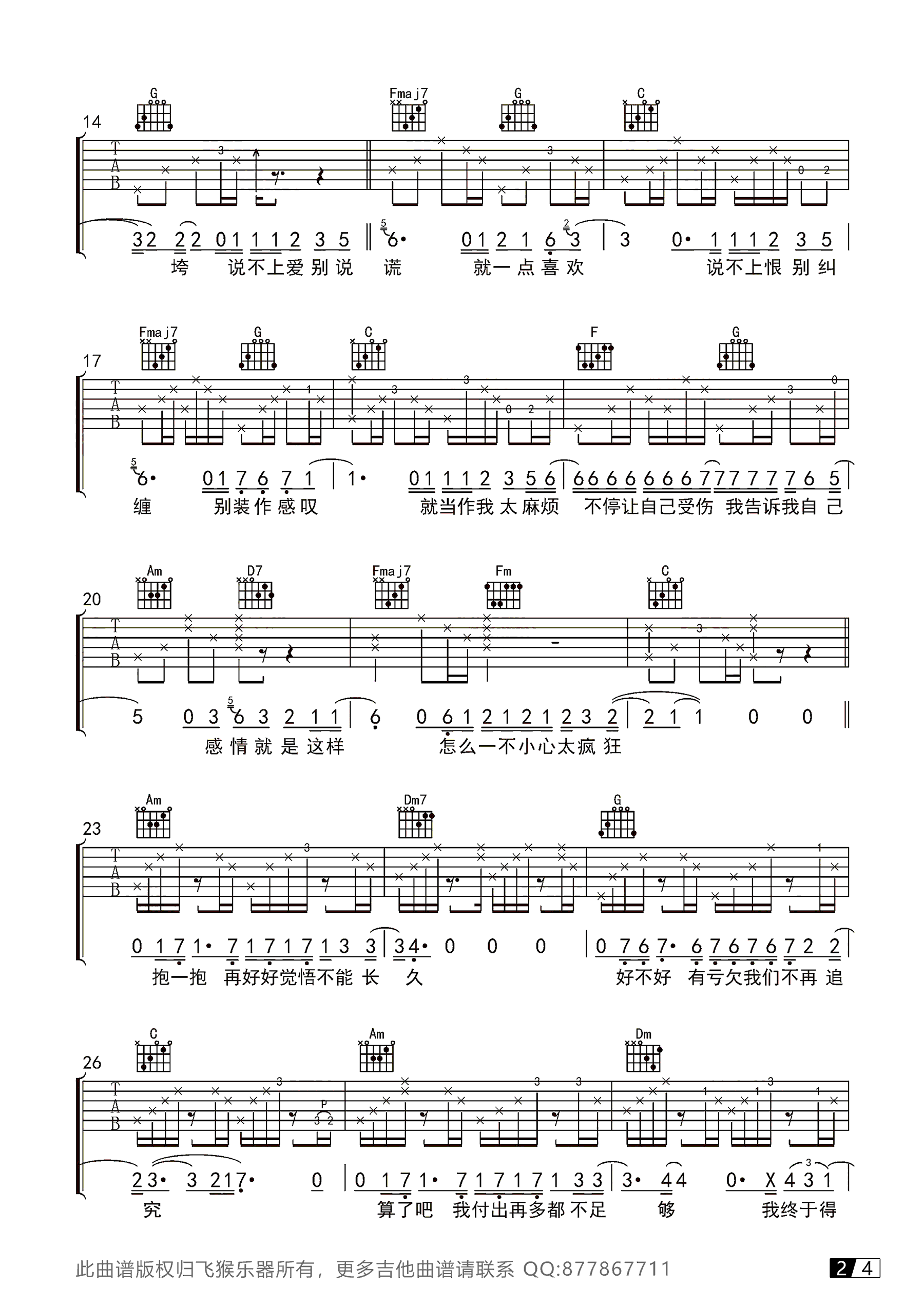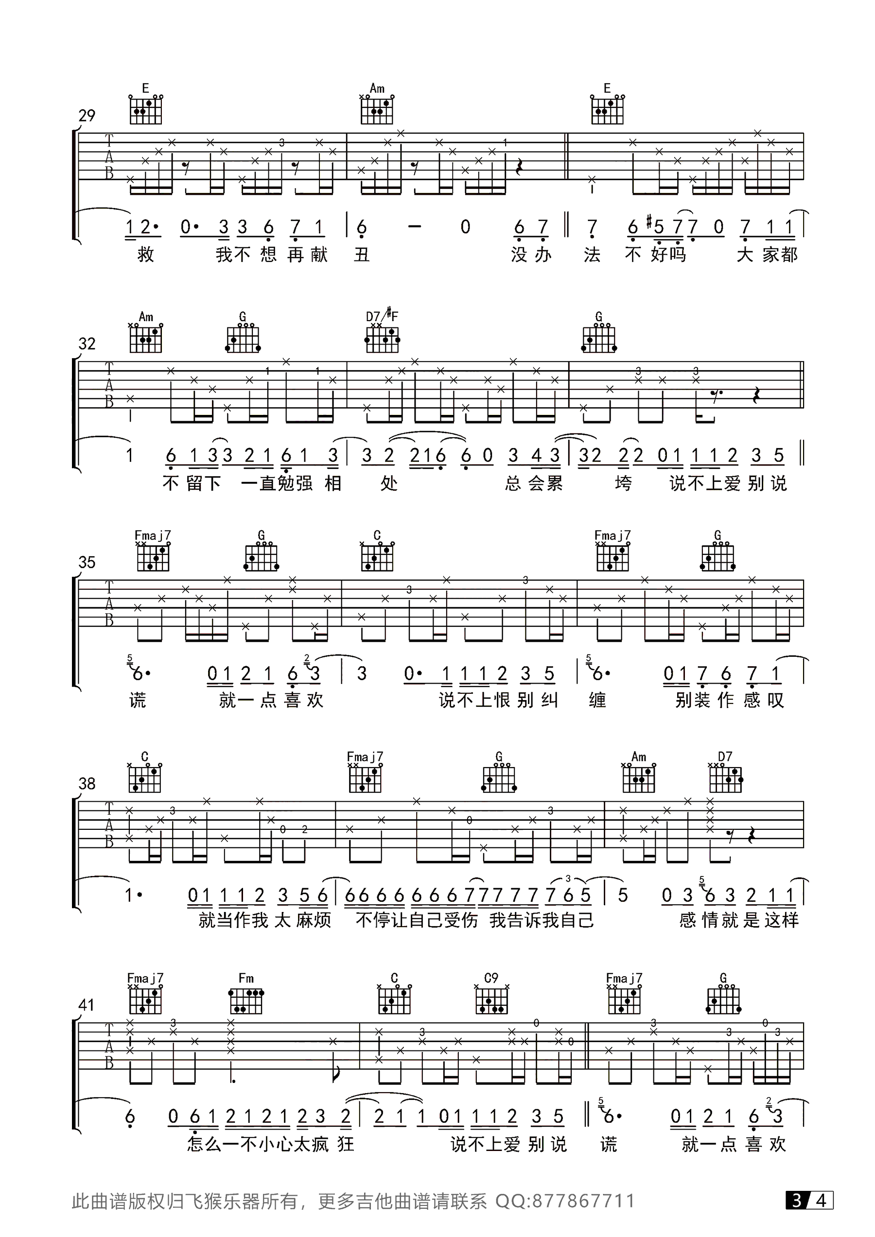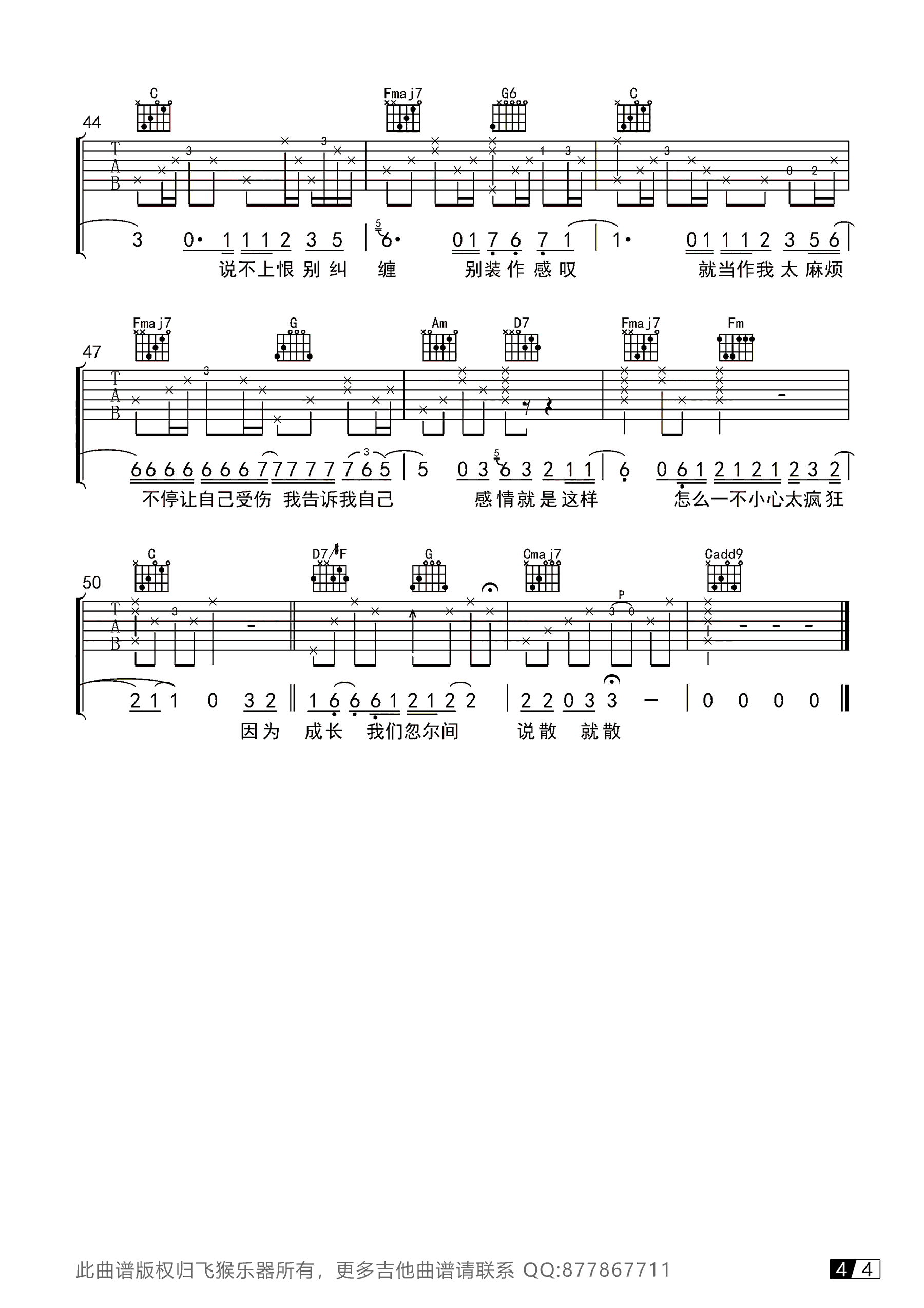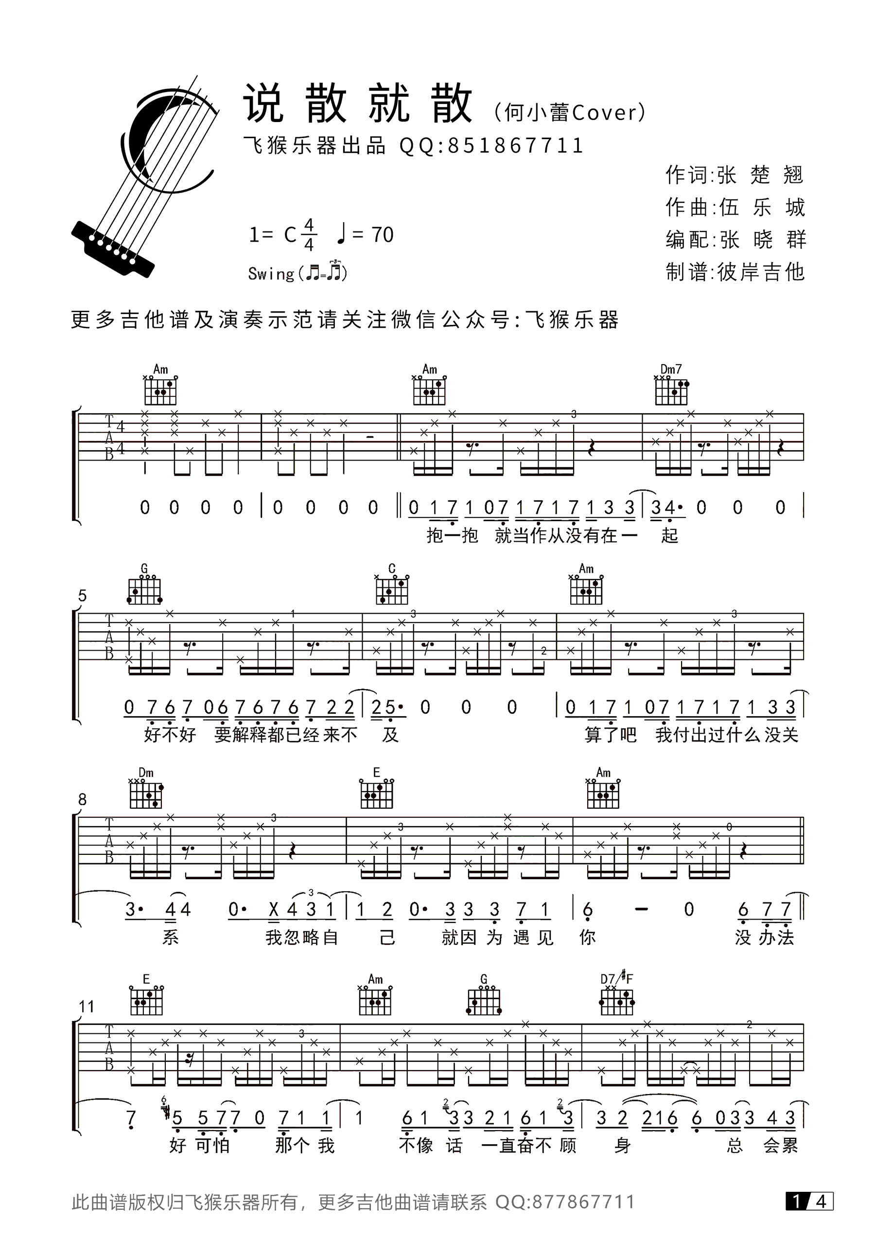 曲谱介绍: 袁维娅《说散就散》吉他谱,前任3电影题曲,说散就散六线谱,四张高清图片谱。选用C调指法,飞猴乐器出品,感谢张晓群编配和提供弹唱视频演示,琴谱网推荐分享。 本曲谱把律动改成了Swing,和其它调版本有了不太一样的感觉,同学们如果觉得节奏有点难掌握,可以多加练习。最后附上张老师和何小蕾小姐姐带来的《说散就散》吉他弹唱视频,大家观赏参照。