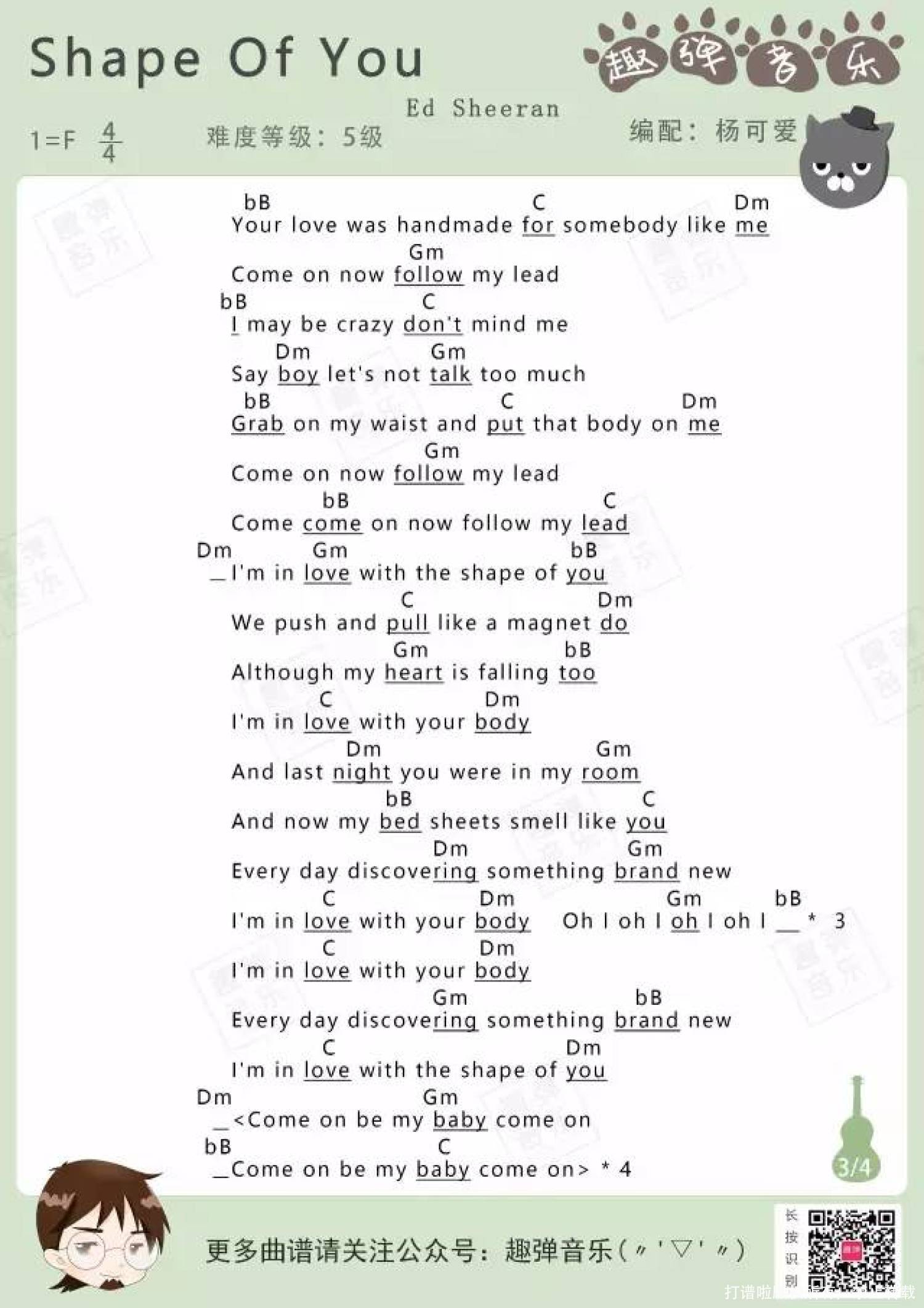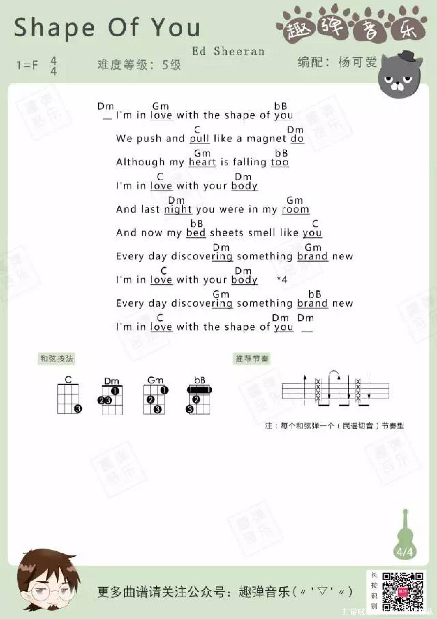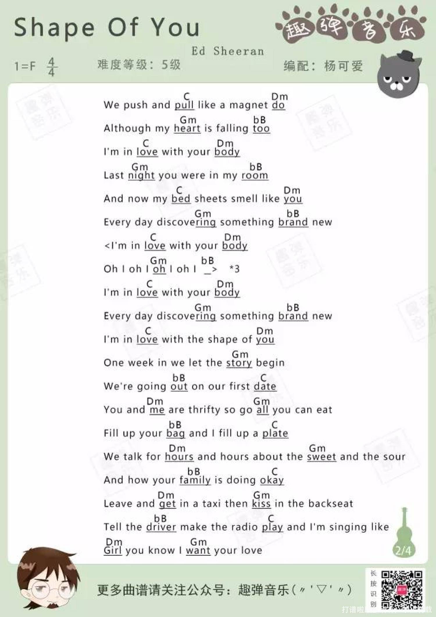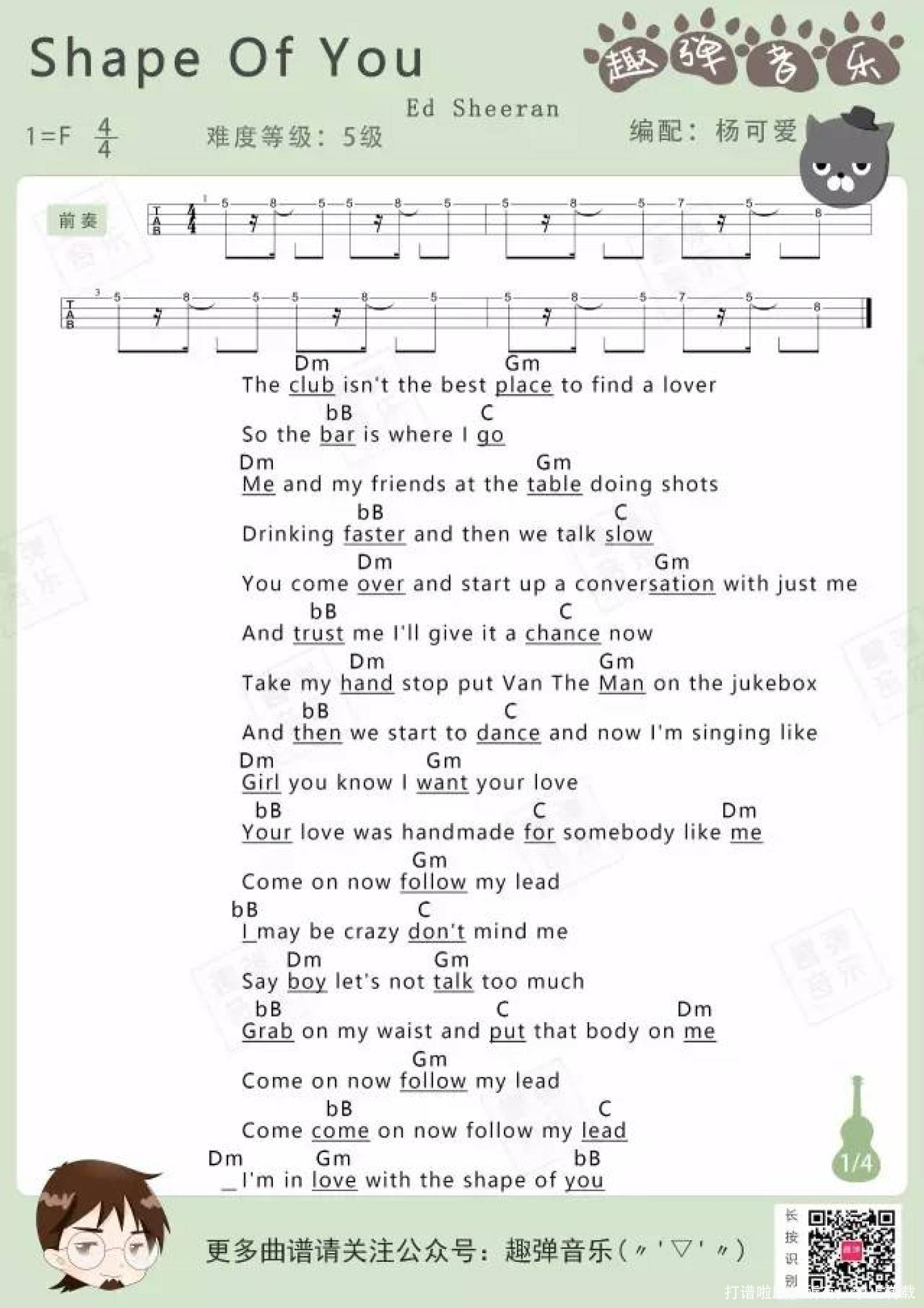 曲谱介绍: 趣弹の音乐日常 我本来是一只住在趣弹小窝的勺子,本以为会为主人舀汤扒饭默默无闻过完这一生。 万万没想到有一天我会被一只尤克里里绑架,意外走上了音乐道路,从此打开了新世界的大门……然后被玩坏了   Shape of You 主 唱:茜 茜      啥都会:Uncle周 尤克里里:灰子      编曲:Uncle周 0分55秒勺子低调露脸~ 想不到吧~一直在幕后默默奉献的我们还有这一手~ 虽然专长不同、性格迥异,但是我们同样热爱音乐,因为喜欢小U而聚在了一起,为同一份热爱发光发热。 由艾德·希(Ed sheeran)、史蒂夫·麦克、约翰尼·麦克达德共同填写词曲。 该歌曲是艾德·希兰在无意中创作出的一首歌曲,创作过程中一直想着女歌手蕾哈娜。该歌曲是专辑《÷》中最后一首完成的作品。 Ed Sheeran 为什么Ed Sheeran被歌迷叫做“黄老板”?因为他唱小黄歌吗? 因为弹幕网站ACFUN有一个叫“黄光裕”的UP主,经常发布Ed Sheeran的视频,后来干脆把ID也改成了"Ed Sheeran"。所以…… Ed Sheeran,1991年2月17日出生于英国英格兰西约克郡,是大西洋唱片(Atlantic Records)旗下的一位歌手同时也是一位创作人。 他不少歌曲都成为了霸占榜单的热门单曲。《Shape of You》一出,许多歌迷纷纷表示献上膝盖,洗脑循环。在网路上也引起各位大佬翻唱和改编。   这首歌超快的语速对非英语专业的趣弹小伙伴们来说,几乎是死亡级别_(:зゝ∠)_ 但还好在无数次舌头打结后,终于顺好了歌词~喜欢这首歌的小伙伴们一起来试试吧~ 趣弹曲谱