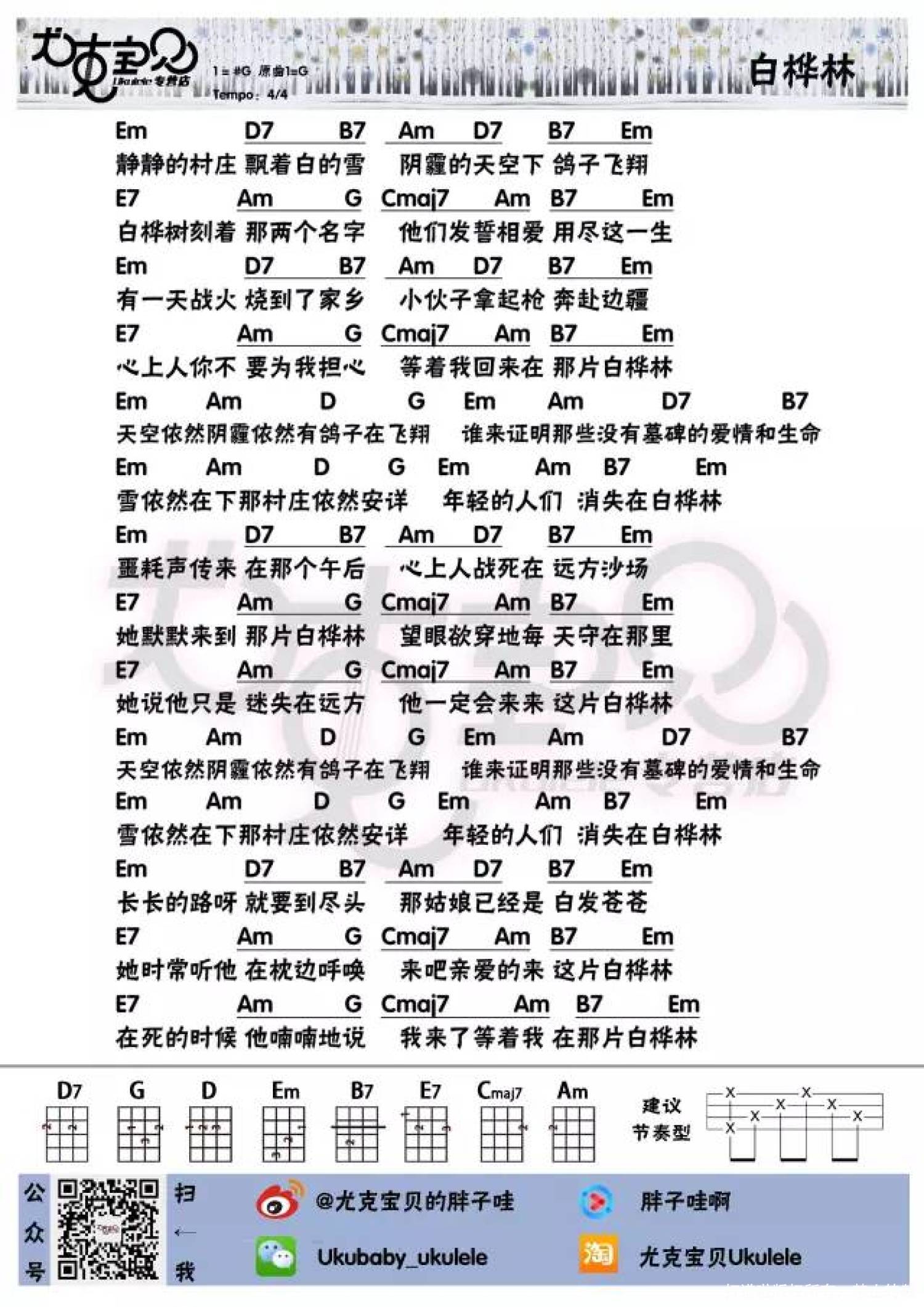 曲谱介绍: ♪ ALOHA ♪ 我 是 胖 子 哇 《白桦林》是前苏联的一首民歌,源自乌克兰,是苏联卫国战争时期的。其灵感是来源于苏联二战时期的一个士兵的故事。 朴树小时候母亲总念叨的俄罗斯歌曲,他改编琢磨出了一个旋律,瞎编了一段故事,然后填上简单明了的词。 四十多的朴树,依然像个孩子。 出走半生,归来依旧是少年。   “好好的Ⅱ” 2017巡演Live版  / 白桦林 / 演唱/词曲 朴树 Ukulele弹唱曲谱