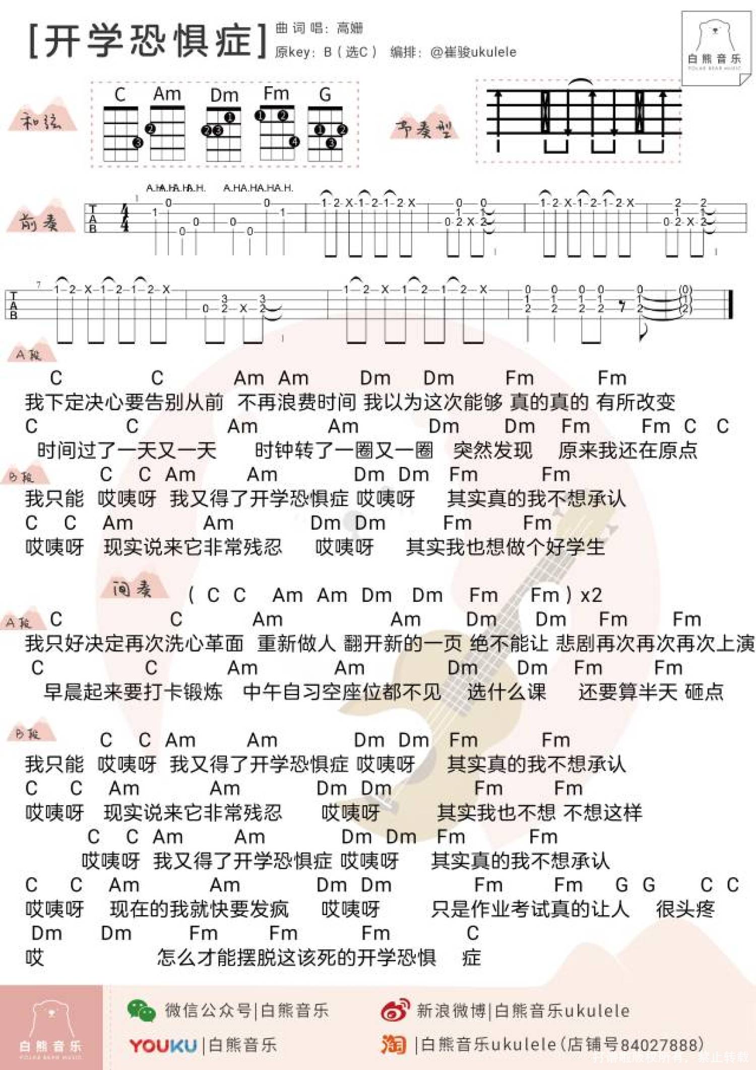 曲谱介绍: 开学啦,你恐惧吗? 暑假过去了 "你想开学吗?" "不想开学,因为习惯了没有上午的生活.....因为开学会有很多很多很多的考试.......还有写不完的作业....开学让我非常地恐惧~" "哎我患了开学恐惧症了~" 分享一首很有趣的歌曲,来自高姗的《开学恐惧症》非常古灵精怪有趣,有很多歌词应该会戳中了你的心声呢~     超萌创意歌曲MV "请将手指伸入设备 咔滴 考勤成功" 早晨起来要打卡锻炼 中午自习空座位都不见 选什么课还要算半天 2013年2月24日,因为一句"可以帮我打马赛克吗?",高姗和她的朋友们一起独立拍摄的《开学恐惧症》mv在网络中迅速走红,并被学生们奉为自己心声的“代言人”,还引发了“老人们”的集体怀旧感伤。 其实我也想做个好学生 其实真的我不想承认 我又得了开学恐惧症 尤克里里歌谱