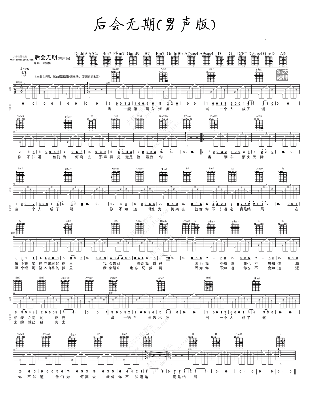 曲谱介绍: 后会无期吉他谱男生版,邓紫棋演唱,韩寒同名电影主题曲。原曲是F调,采用了D调指法变调夹夹三品,感谢大伟吉他编配制谱,琴谱网整理分享。 很多朋友喜欢邓紫棋后会无期,这次就送上大家期待已久的适合男生弹唱的六线谱版本。后会无期吉他弹唱谱,图片谱格式编配,后会无期吉他谱男声版,前奏间奏完美。喜欢的琴友别忘了分享给更多的朋友。