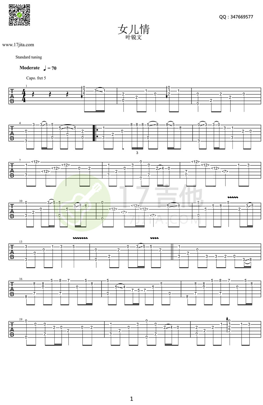 曲谱介绍: 女儿情吉他独奏谱,叶锐文指弹版本,capo夹五品,女儿情吉他谱,高清图片谱。“说什么王权富贵,怕什么戒律清规”----《女儿情》,这么多年了,依然被这首旋律打动,依然为这份爱情遗憾,整部西游记,这也是唐僧唯一一次动了真情吧。