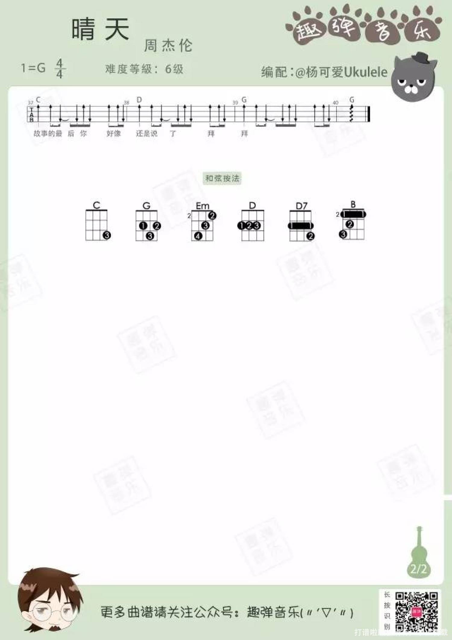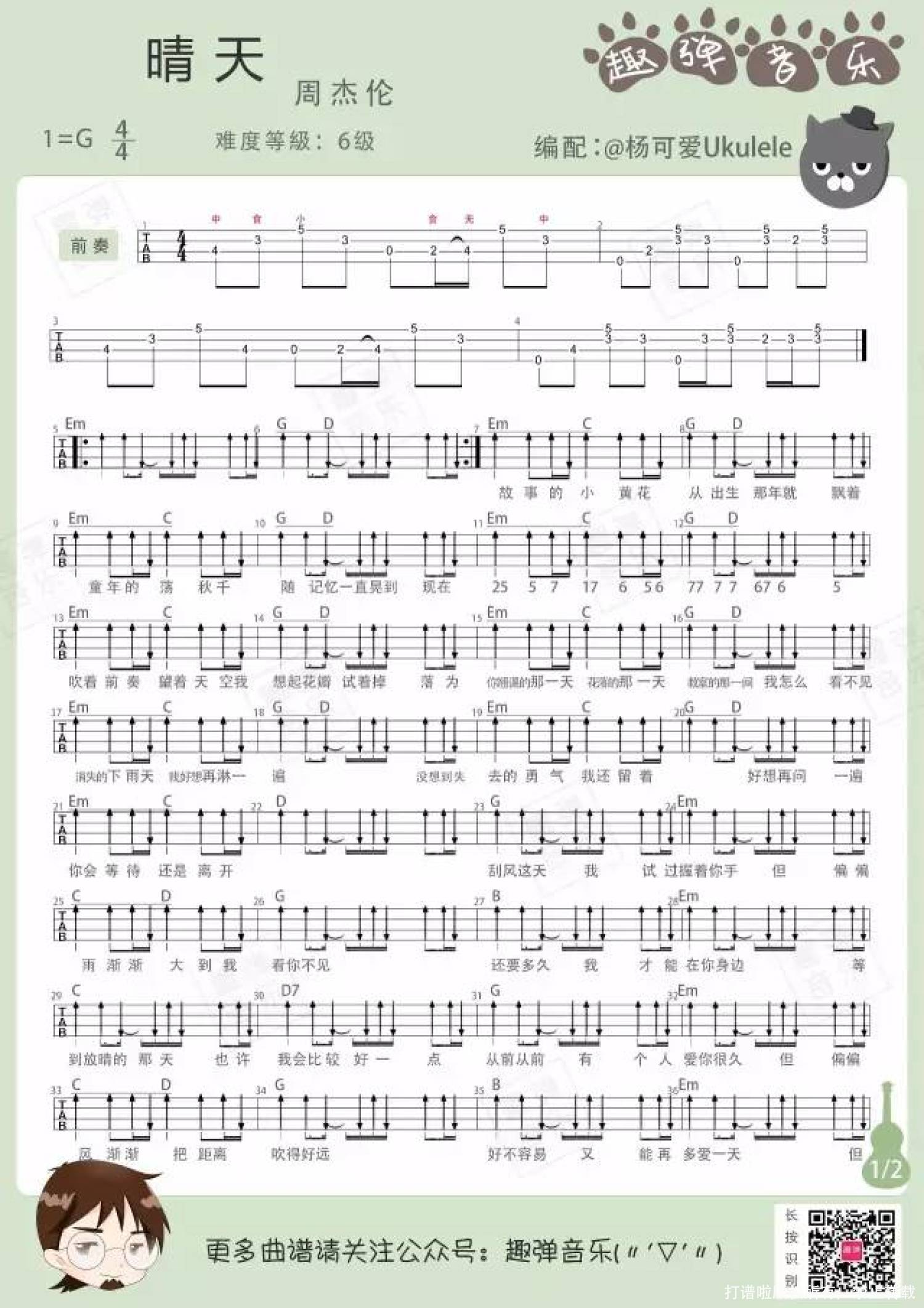 曲谱介绍: 周杰伦这三个字,几乎就是经典好歌的代名词。当经典周式情歌遇上小U,会产生怎样的火花呢?   趣弹MV 主唱:杨可爱 吉他:uncle周 鼓:彭英雄 关于歌曲 我猜,这是当年很多人曾经在笔记本上抄下歌词的一首歌。 这首歌发行于2003年。那一年,刚好是许多90后正值青春、开始触摸“喜欢”这个事物的年纪。 《晴天》里展现的是年少时那细腻内敛,又伤感脆弱的感情,充满青涩单纯与校园的味道。 记忆里明明都是和你在一起欢声笑语的画面,回想起来却眼眶湿润让人想哭。 听这首歌的时候,你会想起某个人吗? ------------------------------- 许多人从前奏开始就被这首歌抓住了耳朵。似乎是周杰伦有一种魔力,就算是最简单的音符,也能组织出独一无二的旋律。 “Re So So Si Do Si La So La Si Si Si Si La Si La So” 干脆抛弃歌词直接唱出音符吧,就好像回到最开始学习唱歌的年幼时光,让整首歌都染上了校园回忆的色彩。 没有华丽酷炫的编曲,没有文艺深刻的词藻,它就是这样一首简单的情歌。   教学视频 弹唱要点 1、慢摇节奏型和摇滚节奏型的交替使用,更符合歌曲感情效果 2、摇滚节奏型的和弦前置 (弹唱6.5课-和弦前置-) 3、前奏中使用了击弦。   晴天曲谱