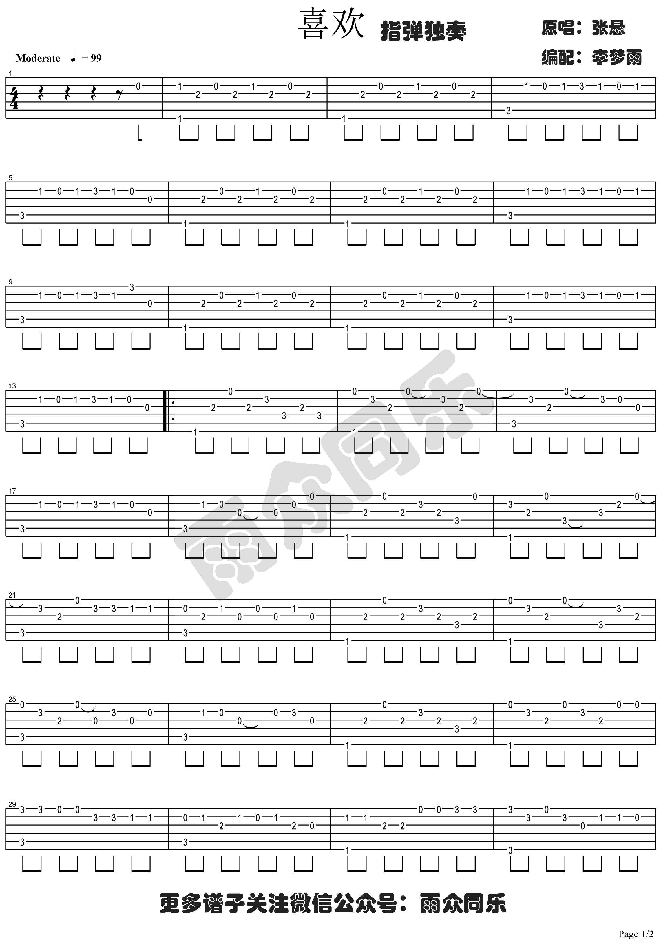 喜欢吉他谱 - 张悬 - 吉他独奏谱