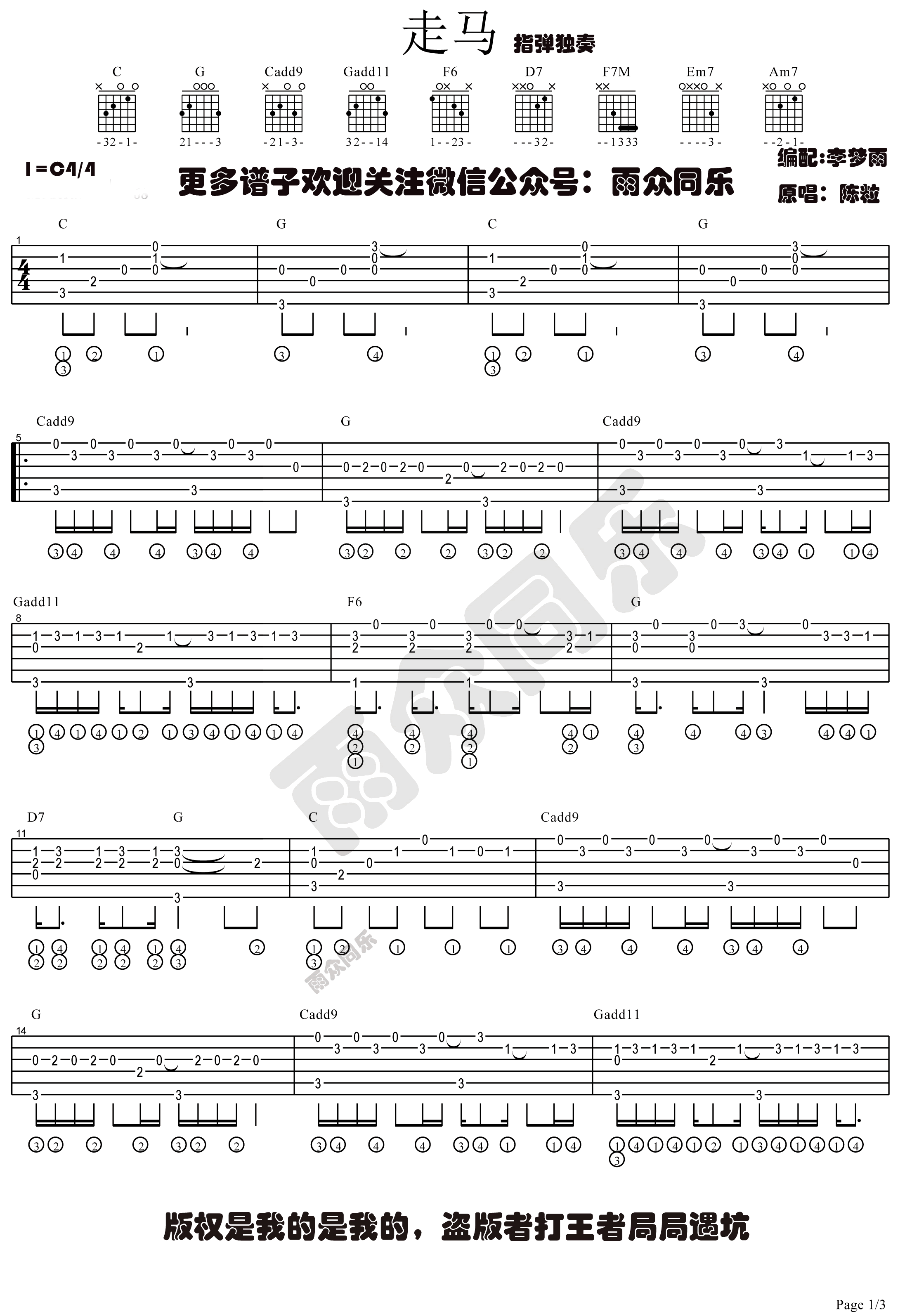 曲谱介绍: 陈粒《走马》吉他谱指弹版,高清图片谱。曲谱根据陈粒的民谣歌曲《走马》改编,走马六线谱,吉他独奏谱,感谢雨众同乐李梦雨编配制谱,琴谱网上传分享。