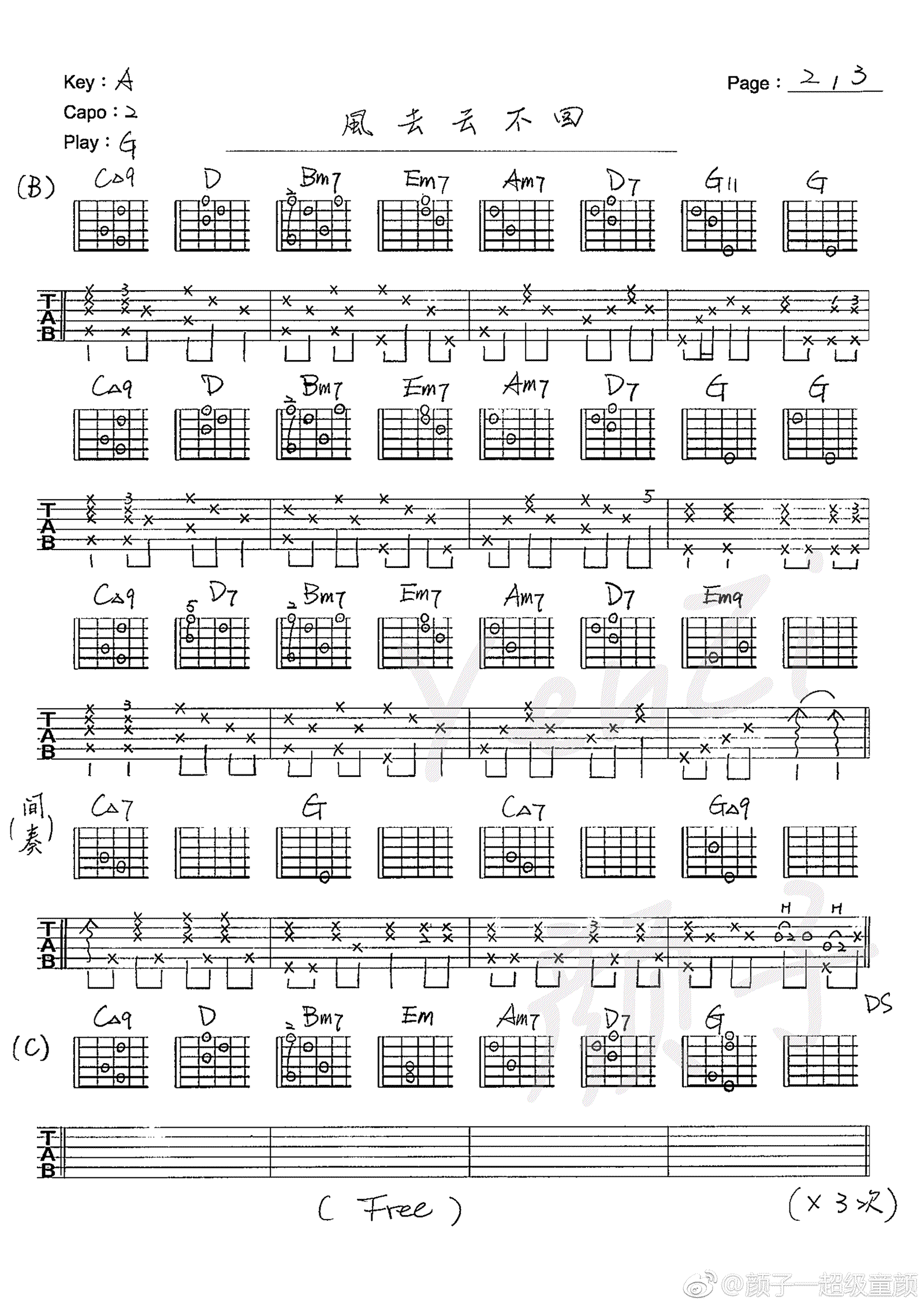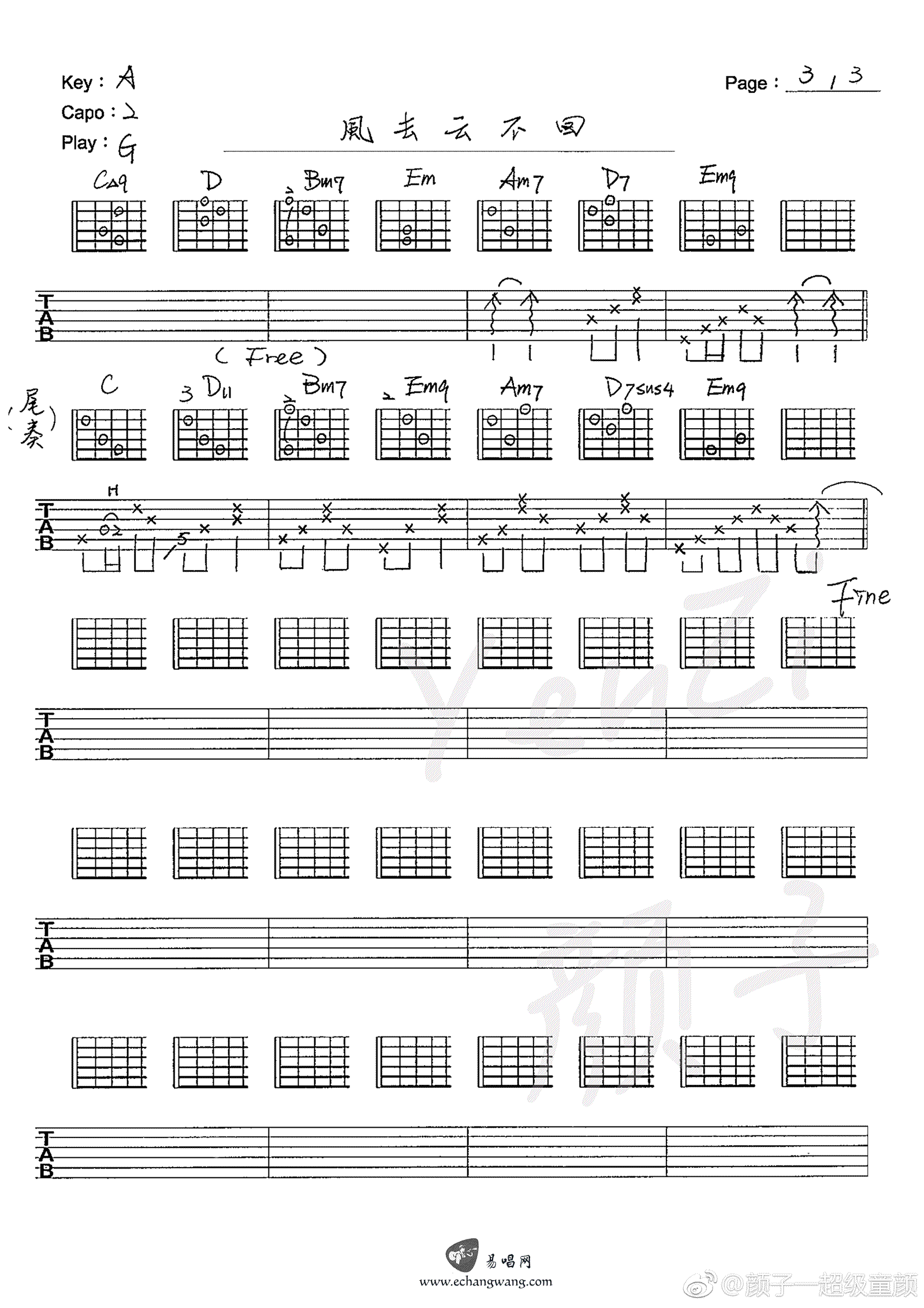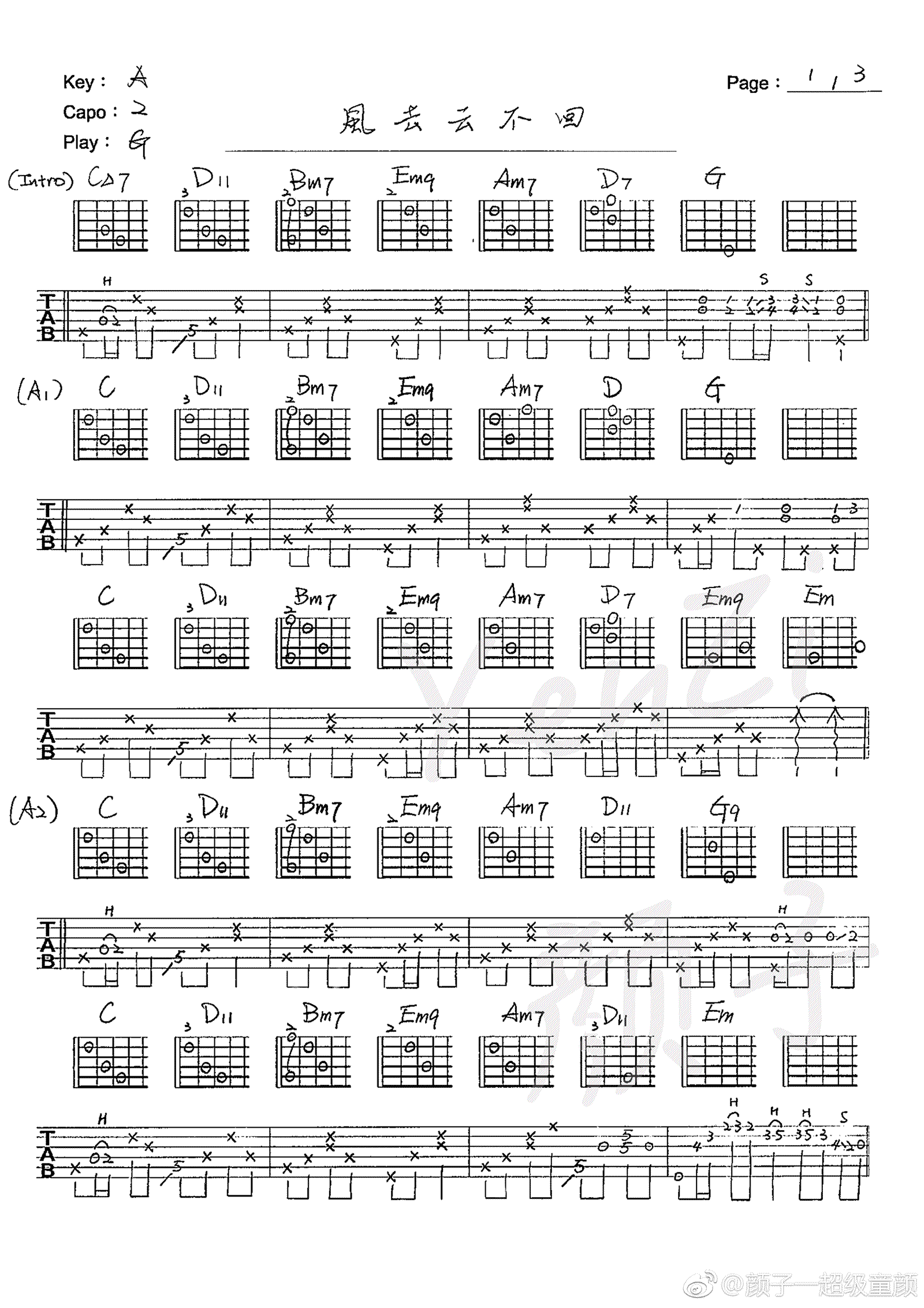 曲谱介绍: 吴京《风去云不回》吉他谱,原调A,变调夹夹二品,选调G,风去云不回六线谱,三张图片谱,电影《战狼2》宣传主题曲,感谢作曲人颜子提供原版吉他谱,琴谱网上传推荐。