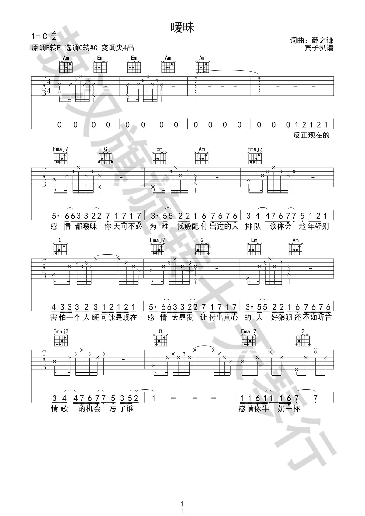 曲谱介绍: 薛之谦暧昧原版吉他谱,原调E转F,选调C转#C,变调夹4品,薛之谦暧昧弹唱谱,四张图片谱。宾子扒谱编配,琴谱网推荐分享。 用最真诚的心,谱最纯粹的曲,唱最动人的情,在薛老板身上看到什么叫做三年河东三年河西,一首苦情歌,带给大家。有一些人是喜欢这种暧昧的情感。实在叫人困惑。在感情快速消费的时代,所谓的暧昧,换不来真心的情感。感谢薛之谦对音乐的坚持,让我们能听到如此用心的作品。