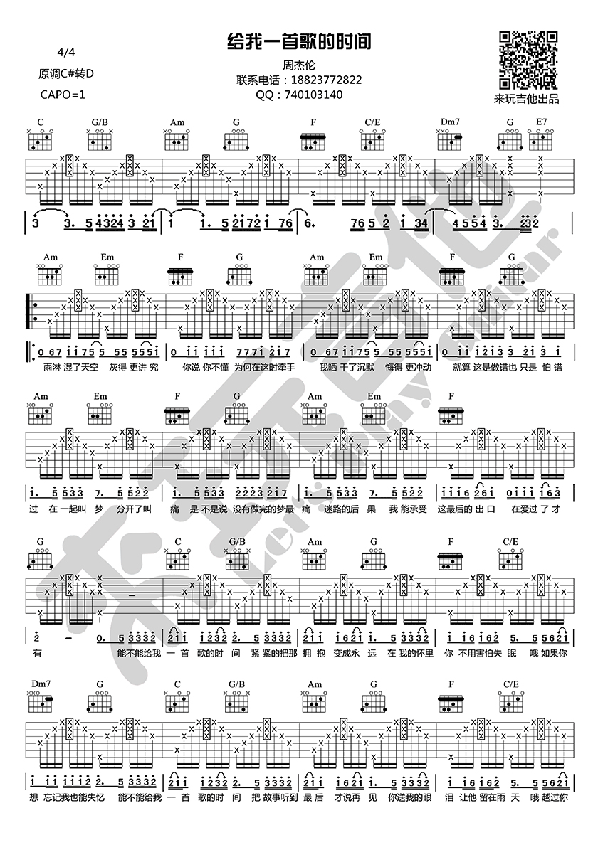 曲谱介绍: 给我一首歌的时间吉他谱,周杰伦的一首老歌,给我一首歌的时间六线谱,原调C#转D,CAPO1品。感谢来玩吉他编配出品。琴谱网整理上传。 《给我一首歌的时间》描写周杰伦当时的爱情,你知道是谁吧?一首带有浓浓的周氏风格的音乐作品。当熟悉的旋律响起,满满的都是回忆和期待。
