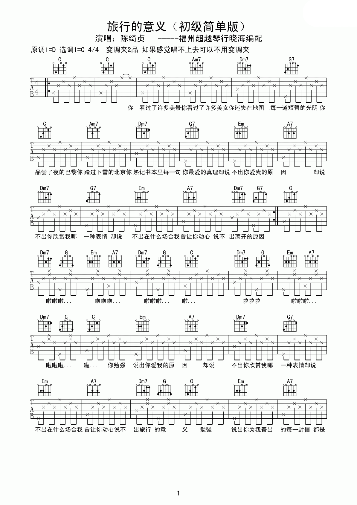 曲谱介绍: 旅行的意义吉他谱,陈绮贞代表作品,旅行的意义吉他弹唱谱,六线谱高清版,两张图片谱。歌曲原调D,选调C,变调夹建议夹2品,如果感觉唱不上去,可以不用变调夹哦。感谢福州超越琴行晓海老师的编配。