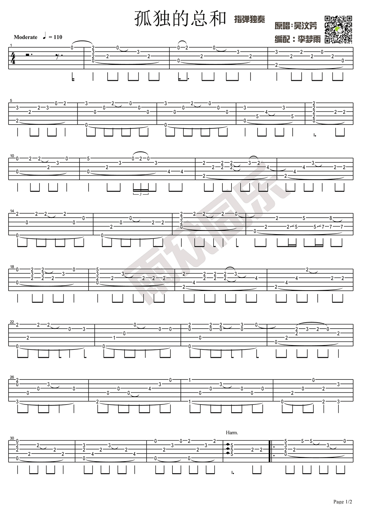 曲谱介绍: 孤独的总和指弹吉他谱,吴汶芳演唱,《何以笙箫默》插曲,孤独的总和吉他独奏谱,两张图片谱。《孤独的总和》指弹独奏谱,来自雨众同乐李梦雨编配。琴谱网整理上传。一曲舒缓忧伤的旋律,非常的受欢迎并有一定的熟识度。