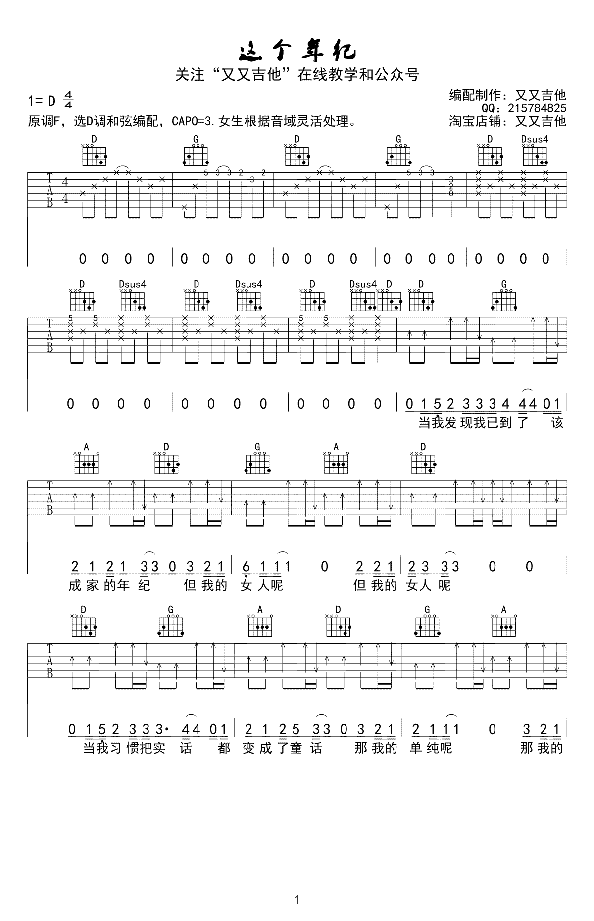 曲谱介绍: 这个年纪吉他谱,齐一演唱,一首好听的民谣歌曲,这个年纪六线谱,五张高清弹唱图片谱,原调F,选用D调和弦编配,CAPO:3品。女生可以根据自己音域可灵活处理。感谢又又吉他的曲谱编配分享,琴谱网为大家整理上传。