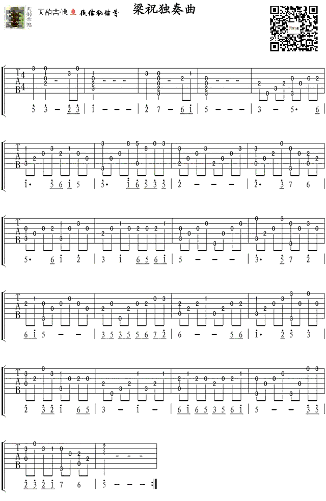 曲谱介绍: 梁祝吉他独奏谱,经典曲目《梁祝》指弹吉他改编版本,六线图片谱。天韵吉他的提供和分享,琴谱网曲谱整理上传。《梁祝》的故事家喻户晓,一曲动人的《梁祝》音乐,也让世人传颂,用吉他弹奏这首《梁祝》,在吉他的润色下,有着强烈的古韵气息,让人听着听着沉醉其中。