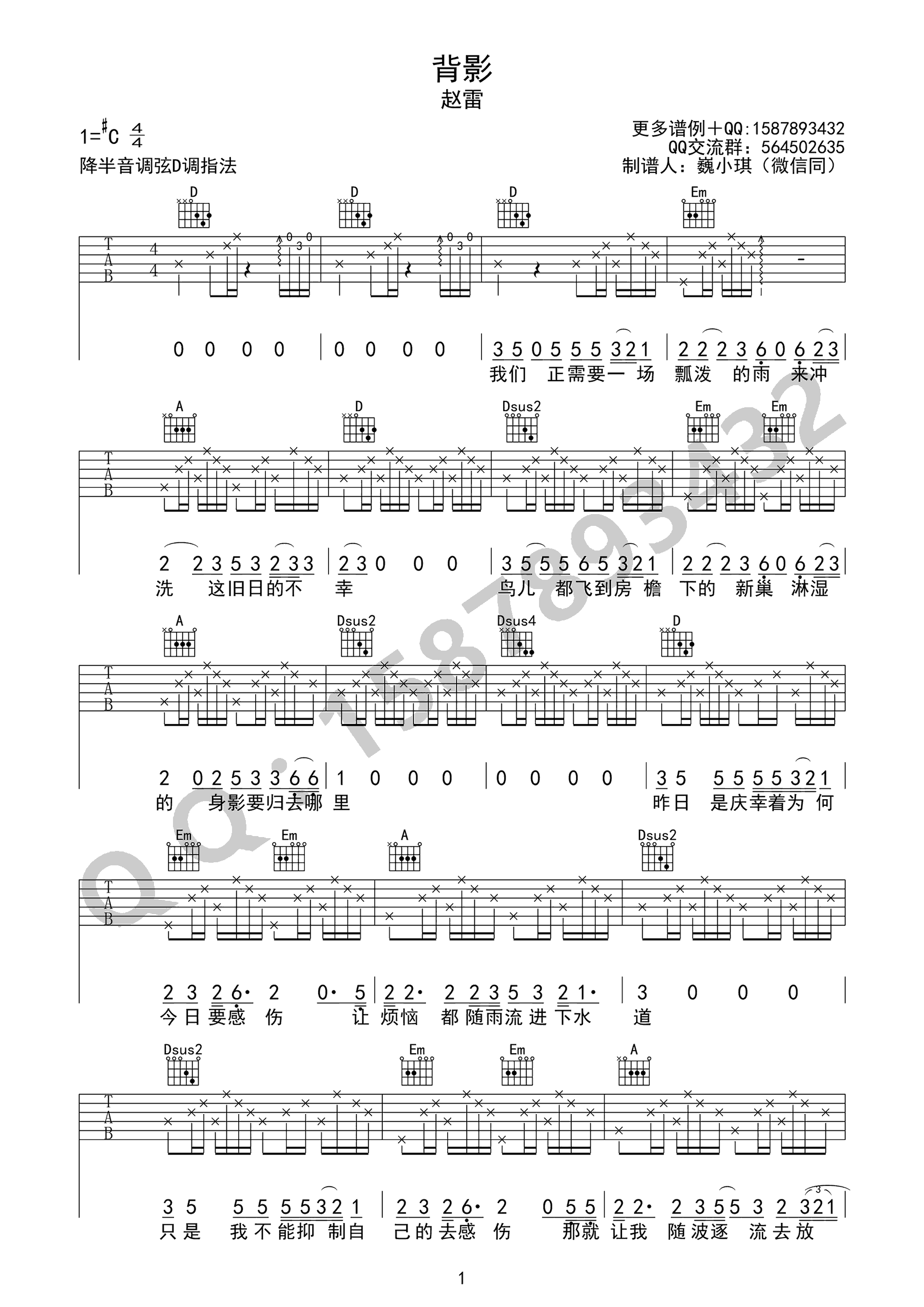 背影吉他谱 - 赵雷 - D调吉他弹唱谱