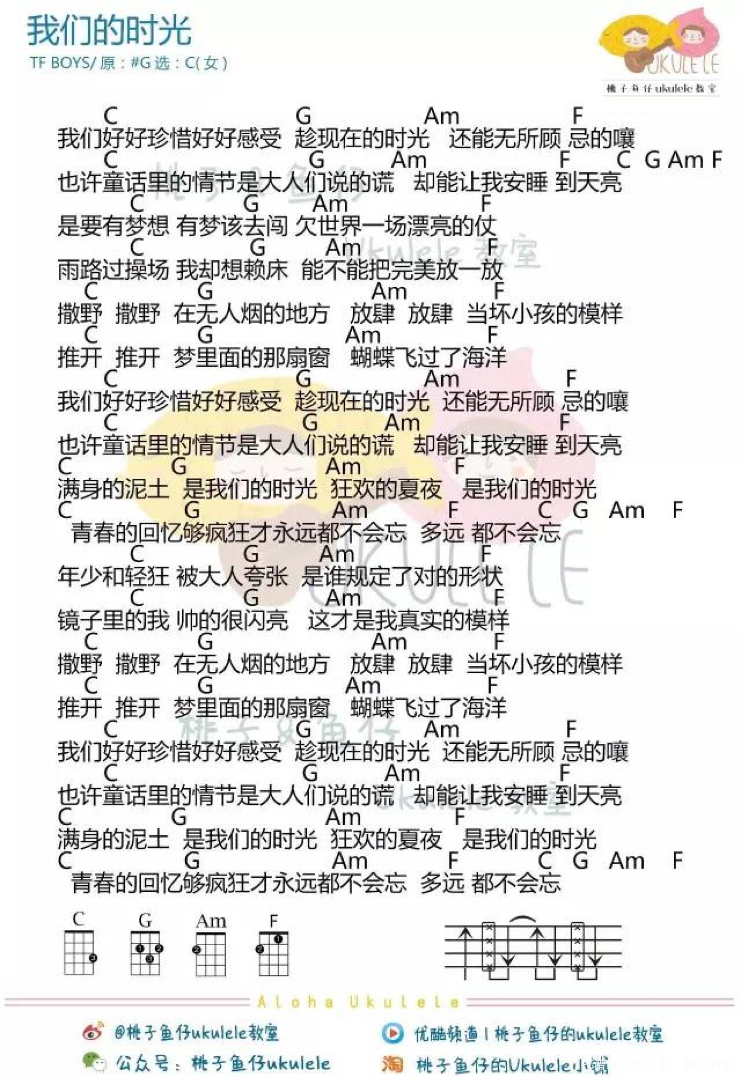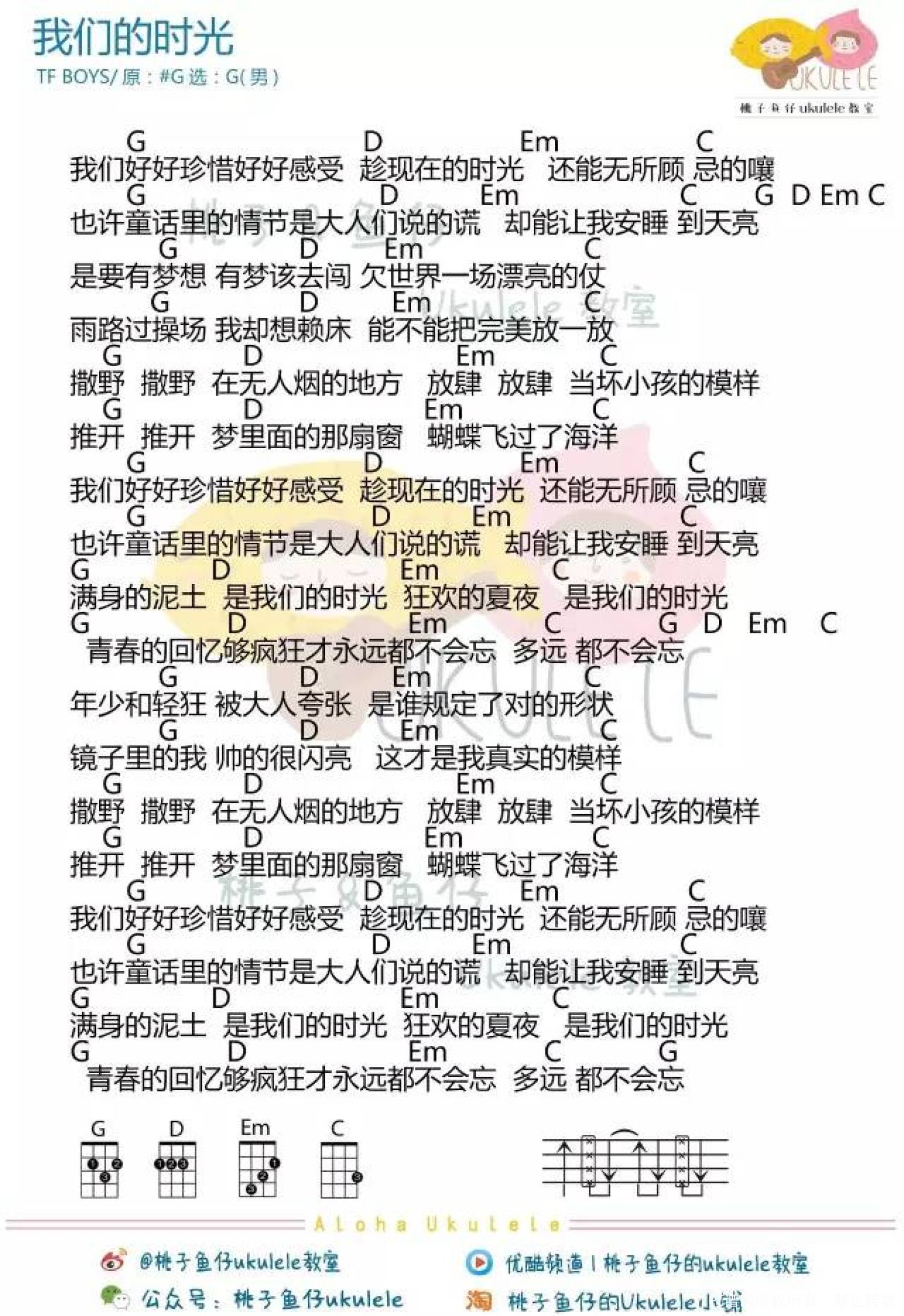 曲谱介绍: TFBOYS最新单曲《我们的时光》正式网络释出。该歌曲是TFBOYS2017年全新专辑《我们的时光》同名主打歌,由国内外知名制作团队倾力打造,动感十足的舞曲旋律搭配TFBOYS青春洋溢的演绎,展现出自由快乐,个性张扬的年轻态度。 TFBOYS新歌《我们的时光》由多次合作格莱美获奖艺人的音乐制作团体Mr.Fantastic神奇兄弟作曲,知名才女词作人王韵韵作词,中外团队联合倾力打造。《我们的时光》曲风偏流行舞曲,旋律热情明快,婉转悠扬,歌词道出年轻一代自由浪漫的生活状态。搭配TFBOYS三人动感十足青春洋溢的演绎,仿佛重新回到了那段自信张扬个性十足的青春年代,无忧无虑的欢乐少年时光。展现了少年之间纯真的友谊,自由自在敢想敢闯的年轻态度。 据悉,《我们的时光》即将在8月11日和13日于南京举办的TFBOYS四周年演唱会上首唱,TFBOYS特别排练的三人齐舞也即将在演唱会上首度曝光。作为TFBOYS成立四周年为粉丝精心准备的重磅惊喜,今年TFBOYS四周年演唱会即将点燃今夏,万众瞩目值得期待。   ● 干净沉稳的声线,抓耳的音色音准,个人风格的技巧处理,控制感与力量的化繁为简。滑音接带重拍,愈加饱满的气息,年轻又新意的演唱创意。以其独特思考灌注于音乐,传达于情绪,实力唱跳俱佳。 ●时光流动,有别于刚刚出道时的青涩歌喉,用心唱歌的少年嗓音已经变得成熟浑厚,声线也更加干净和清秀。对歌曲的处理有独特的技巧,情感和力度的把握稳定细腻。 尤克里里弹唱谱 男生谱 女生谱