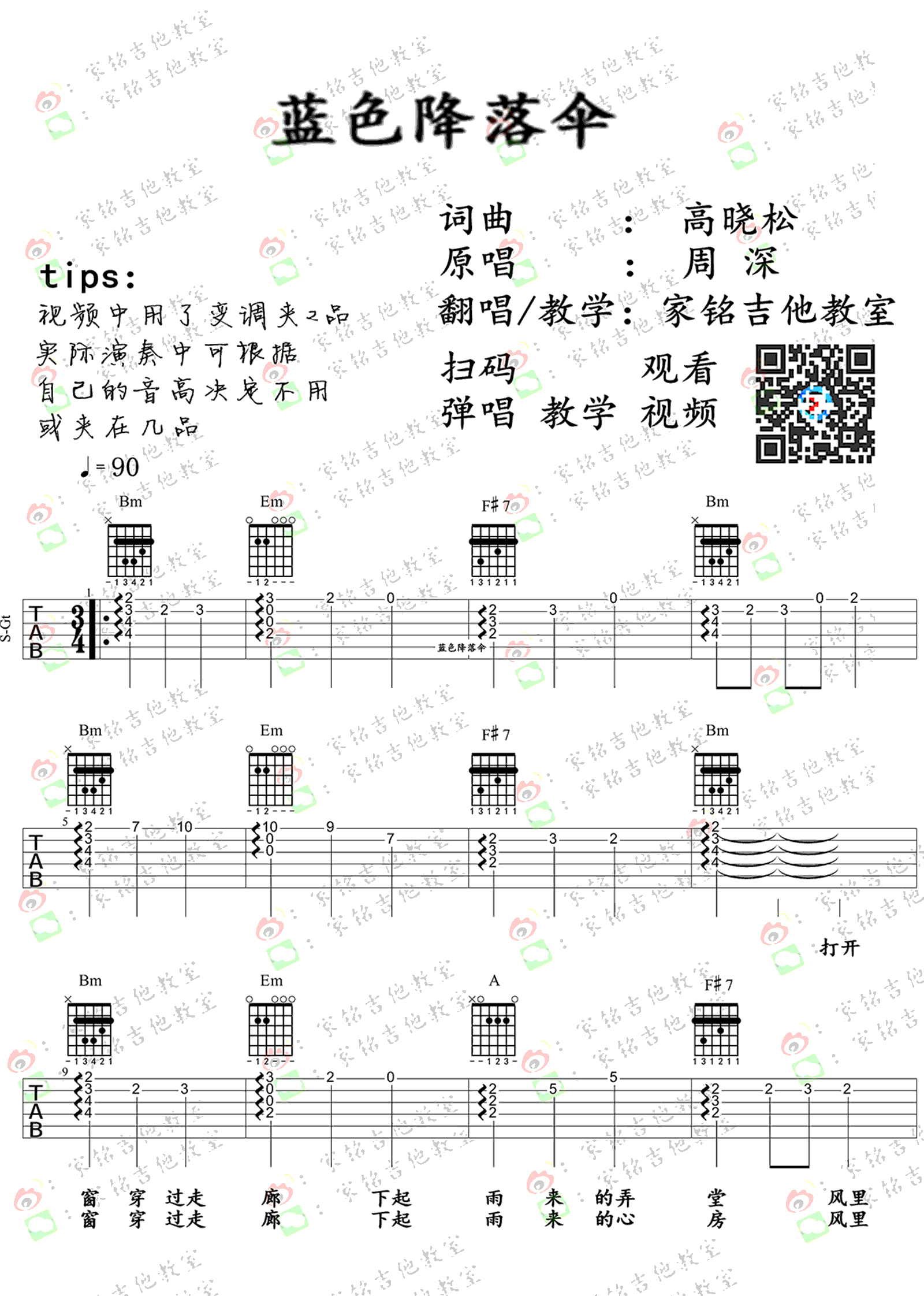 曲谱介绍: 蓝色降落伞吉他谱,周深最新演唱,由高晓松作曲尹约填词的一首动听歌曲,《蓝色降落伞》六线谱,三张高清片谱,演示视频中用了变调夹二品,实际弹奏时可以根据自己的音域决定是否使用。感谢家铭吉他的编配和提供,琴谱网推荐分享。清澈美好空灵动人的歌声,唱出淡淡的感伤,那份为人不识的孤单,在喃喃细语中,道不尽的是最美时光的期盼。