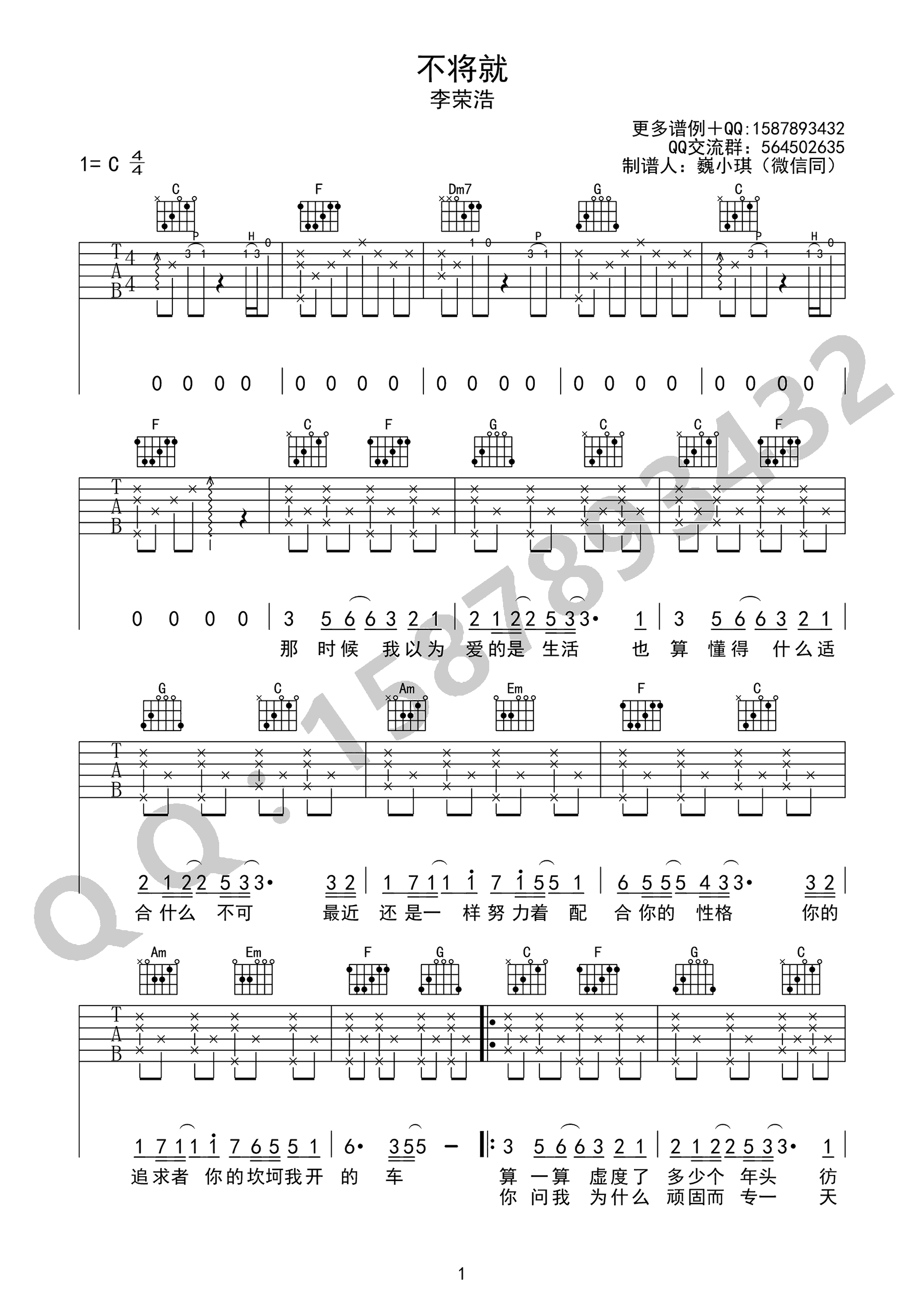 曲谱介绍: 不将就吉他谱,李荣浩演唱《不将就》六线谱,编配带动听的前奏,三张高清图片谱,选用C调指法,感谢巍小琪制谱,琴谱网李荣浩吉他谱整理上传。