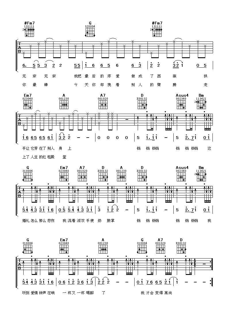 曲谱介绍: 婚礼进行曲吉他谱采用了D调指法,由阿潘音乐工场编配完成。看到这首歌曲的名字的时候,我以为是一个快乐氛围的歌曲。《婚礼进行曲》这首歌曲淡化了痛定思痛的理性,而是以极为感性的角度完整讲述了一个从经历幸福,最终痛失一切的爱情故事。胡彦斌的演唱发挥了他的声音特质,十分深情。在一首歌中,融入欢喜,悲伤两处感情线索,在对比中,更显出创作人内心无法掩藏的悲痛。听说,有魅力的帅哥美的都在悄悄练这首心瘾吉他谱,小伙伴们也快练起来吧~
