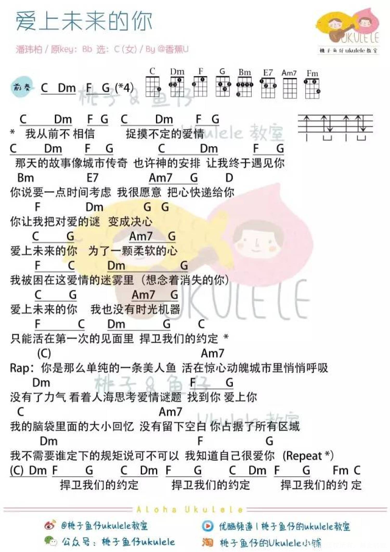 曲谱介绍: ● 不知道迷弟迷妹们还记得当年的潘玮柏吗 有着温暖帅气的脸 玩着麦克风唱着饶舌歌词的阳光大男孩~ 《壁虎漫步》、《反转地球》、《快乐崇拜》、《不得不爱》以及很多很多歌都是当年的流行曲目 最近他回来了 出了新专辑 拿了《中国有嘻哈》公演第一名 还参加了恋爱节目秀恩爱~帅颜不减当年呀!! 关于歌曲 《爱上未来的你》是潘玮柏的歌曲,收录于专辑《我的麦克风》中。易家杨作词,谭荣健作曲,王治平编曲,是潘玮柏早期难有的抒情歌曲。 是一种“痴情到底”的情歌,歌中男生感叹自己没有时光机器可以回到两人过去,只能永远活在第一次见面的回忆里,简单的文字和旋律充满单纯真挚的情感,是一首不可多得的好歌! 青涩的MV~ 最近 潘玮柏在恋爱综艺《我们相爱吧之爱有天意》中对吴昕深情献唱《爱上未来的你》甜炸啦 ♡   潘玮柏在节目中深情献唱 「爱上未来的你」 第一次上节目时,潘玮柏吐露心声称因为明星这一身份,让他无法向普通人一样谈恋爱,“大概21岁的时候就没有在路上牵手过,在路上牵手对我已经是失去的回忆。”吴昕的主动让潘玮柏感受到从未有过的新鲜,“因为我是一个不喜欢把甜蜜展示给人家,尤其是在外面给人家看的人。 吴昕曾提到潘玮柏是自己的“儿时偶像”,最喜欢那首《爱上未来的你》。于是,潘玮柏现场唱起了这首歌:“昕昕,你第一次看到我、认识我的慢歌是《爱上未来的你》,这首歌我是我第一次只唱给一个人听。所以,这是我第一次唱给你,昕昕。” 唱完《爱上未来的你》,潘玮柏的表白可以用“全程高能”来形容,“我们其实之前也认识,到现在已经慢慢打开心了,慢慢地更加彼此的了解了,之前都是比较非正式一点,所以今天想通过这个场合和刚刚那首歌,正式地跟昕昕说,我们可以正式交往吗?”   尤克里里曲谱