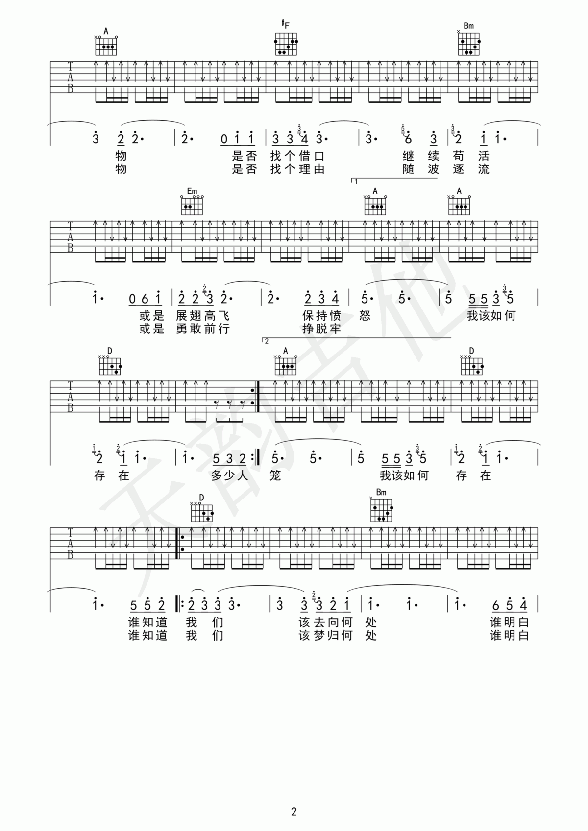曲谱介绍: 汪峰《存在》吉他弹唱谱,采用D调指法编配,共有3张高清图谱。