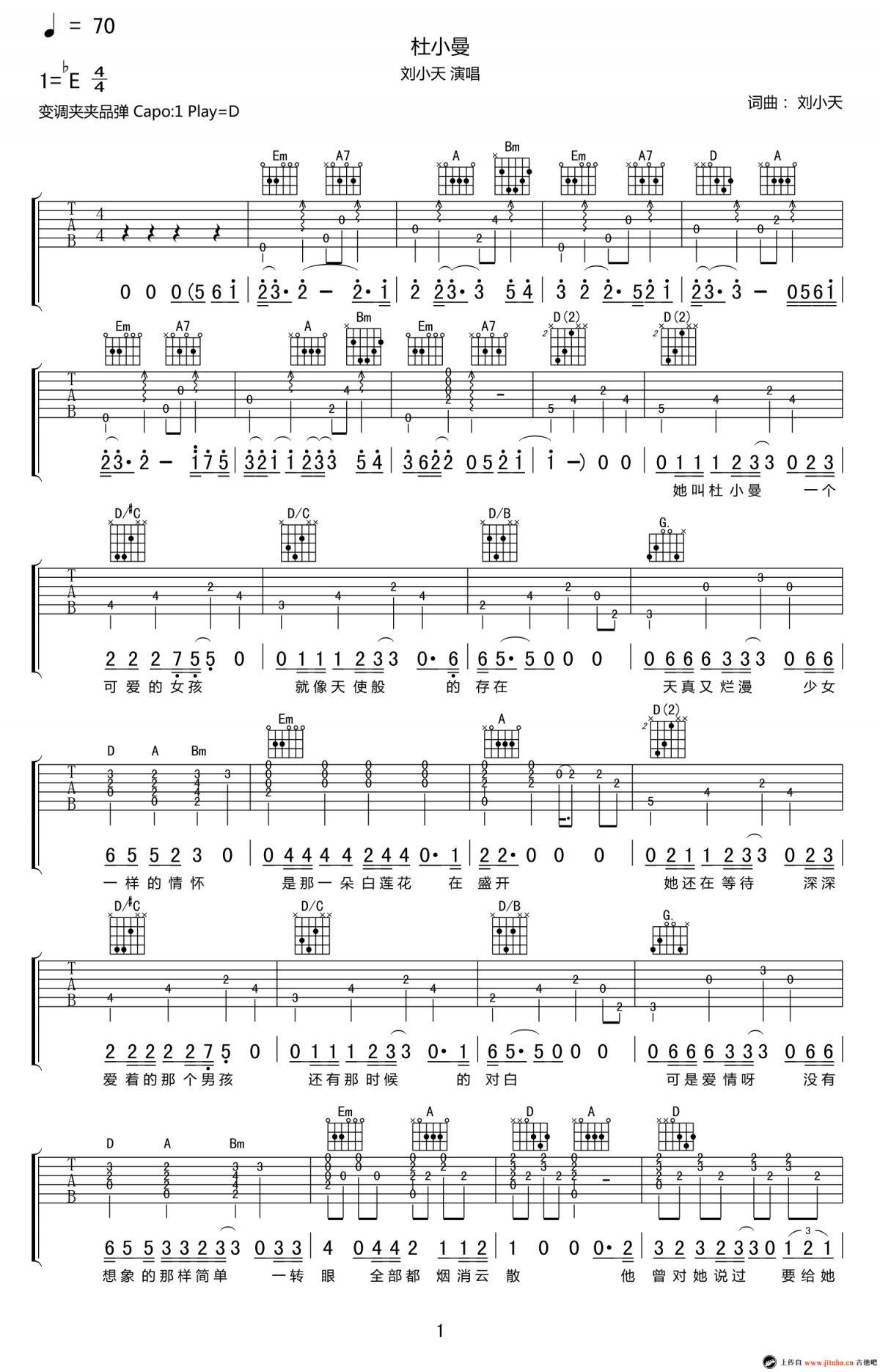 杜小曼吉他谱 - 刘小天 - D调吉他弹唱谱