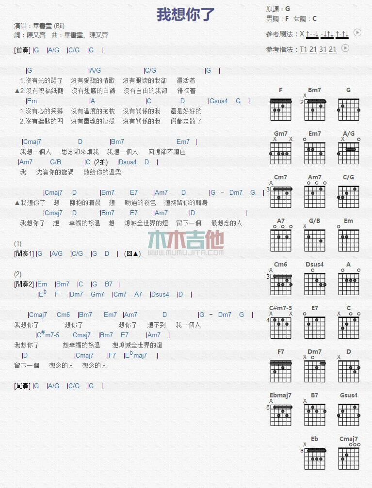 我想你了吉他谱 - 毕书尽 - F调吉他弹唱谱
