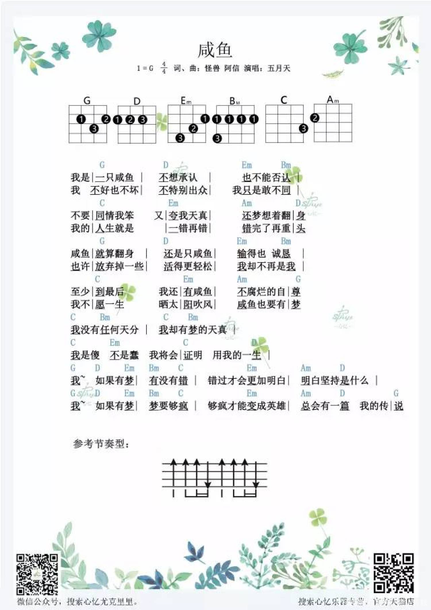 曲谱介绍: 此曲由阿信填词,怪兽谱曲,收录于五月天2005年发行的专辑《知足》中。 五月天曾在2005年的世界巡演演唱会上演唱过此歌曲。 创作背景 《咸鱼》这首歌的创作灵感来源于2001年周星驰的电影《少林足球》里面有一句话:人如果没有梦想,那跟咸鱼有什么两样。 咸鱼 (Live版) 《咸鱼》就是他们自己的励志歌曲,很细腻,也很感人。这种感人并不是刻意的安排,粗劣且不负责任的编造,它经常会让人忍不住眼睛一下一下热了再热,他们的感人是一种让人起鸡皮疙瘩的真实的内心触碰。 其实我们都像这一尾咸鱼,没什么特别的地方,甚至一丟进人海就找不到,但是我们也要相信咸鱼也有翻身的一天。坚持梦想,坚持你认为是对的东西,即使输了,至少尝试过,不后悔,年轻天真疯狂无畏敢不同。   尤克里里弹唱曲谱
