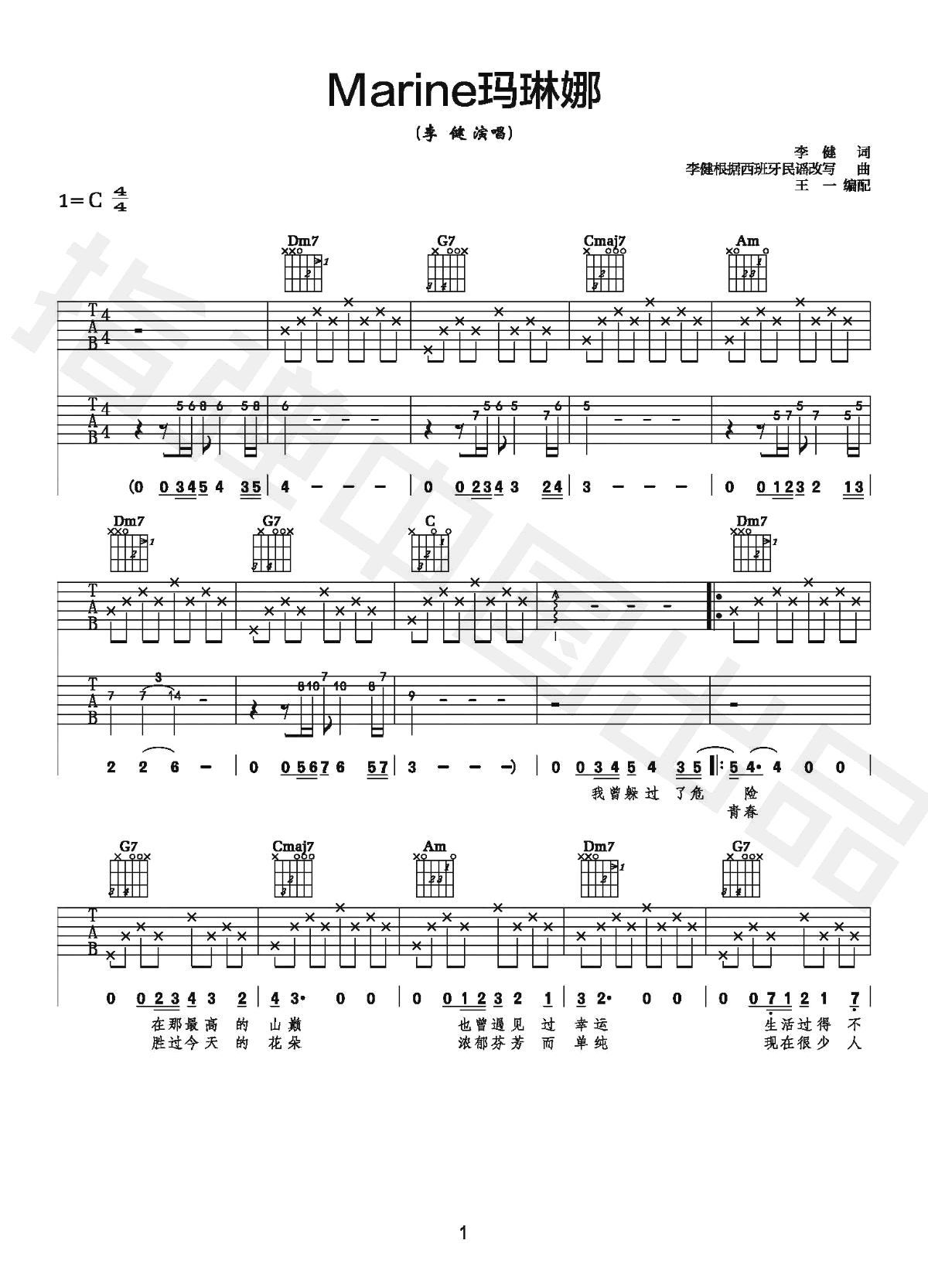 Marine玛琳娜吉他谱 - 李健 - C调吉他独奏谱