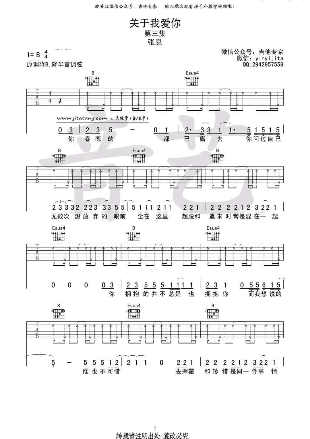 关于我爱你吉他谱 - 张悬 - B调吉他弹唱谱