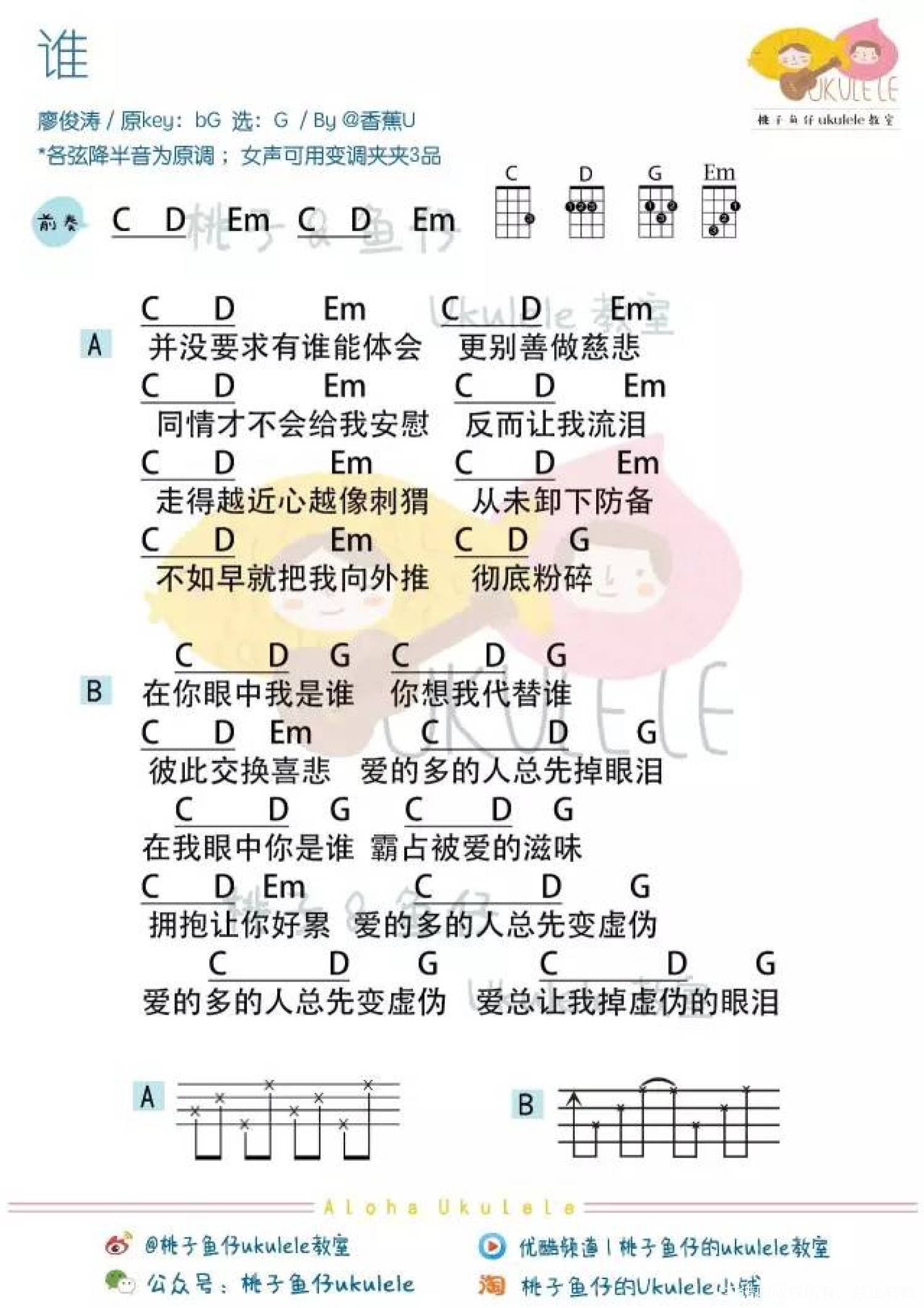 曲谱介绍: 廖俊涛,《明日之子》参赛选手。 没有标签    大型音乐偶像养成节目《明日之子》薛之谦盛世独秀赛道选手,吉他弹唱原创《谁》获得才华星推官薛之谦的超吉666,同时也遭到网友一众评价:“扎心了”,进而被听众封号成了“扎心歌手”。 “在你眼中我是谁,你要我代替谁” 让人越听越深   歌词里充满触动人心的东西,没有华丽的包装,却充满内涵。仔细聆听他的歌曲,那些可以让你安静的旋律也可能让你内心澎湃。 在最近一期节目中,廖俊涛遗憾离场了。整个场上人几乎都是哭着的,老薛落泪了,张大大落泪,整个盛世独秀的人都落泪了,王竟力也是泪流满面。 薛之谦说,我真的很想帮你,因为我怕没有这个舞台,你可能还要再努力个十年,所以对廖俊涛的选择他是心疼的,他心疼所有有才华的,他希望自己可以至少为他们做些什么,而不是再等待一个十年,所以,他上一轮会力保毛不易,这一次对于廖俊涛的选择心疼。   尤克里里曲谱