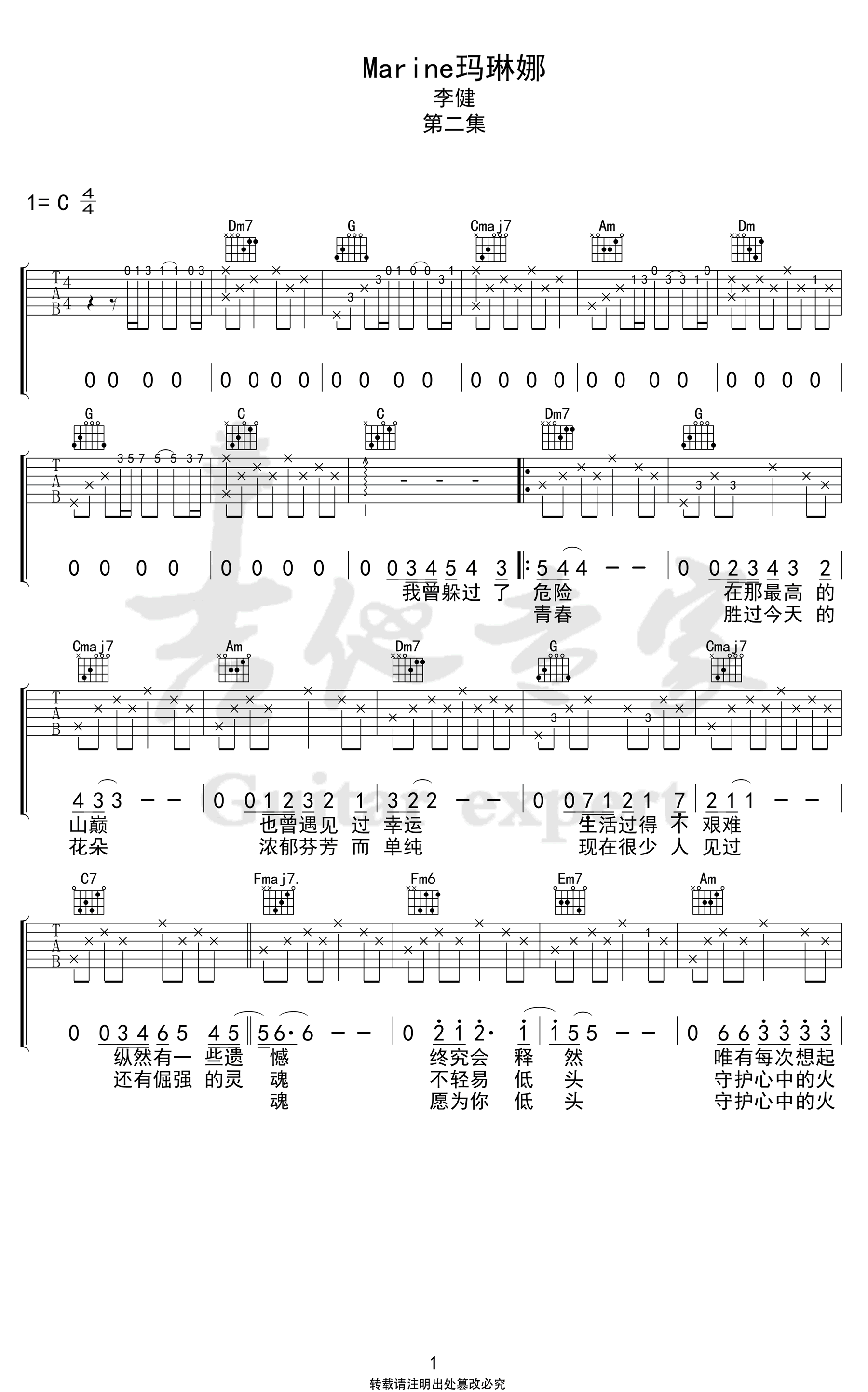 Marine玛琳娜吉他谱 - 李健 - C调吉他弹唱谱