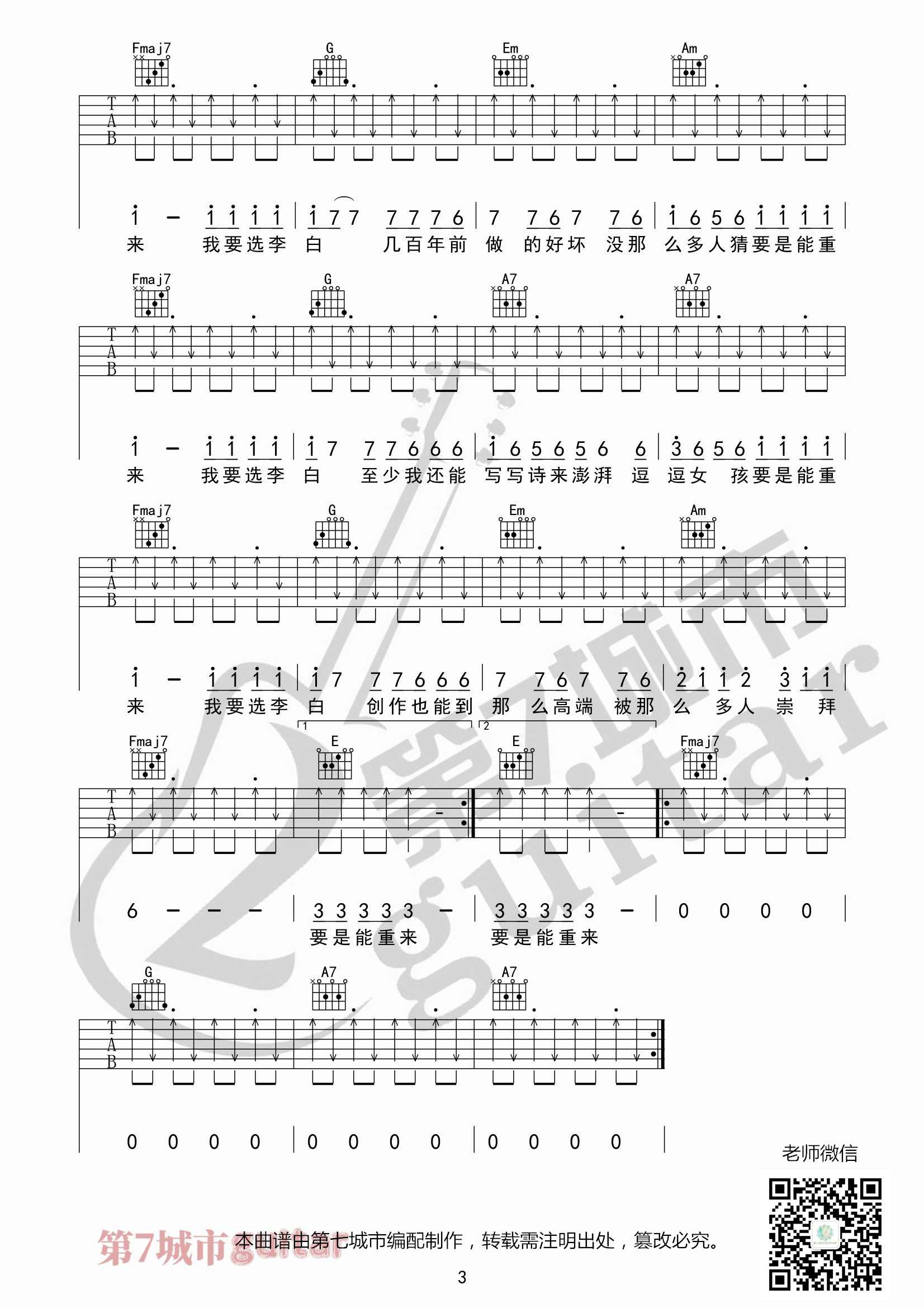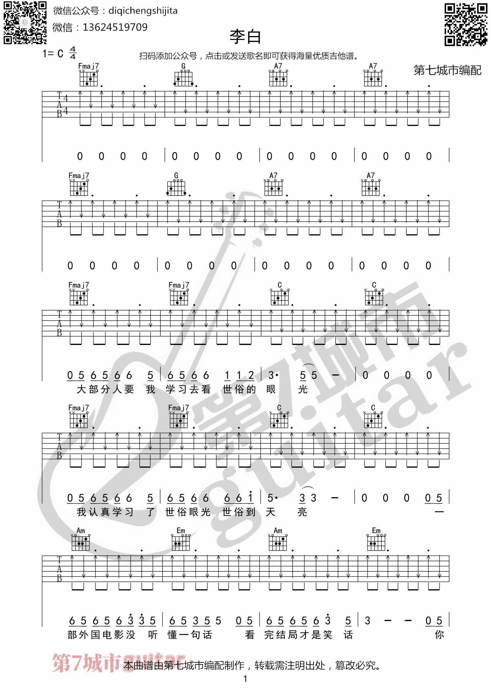 曲谱介绍: 本曲谱由第七城市编配制作,曲谱选用C调和弦,变调夹0品,不包含横按和弦,适合入门的吉他玩家。《李白》是李荣浩作词、作曲、编曲并演唱的歌曲。简洁明快且有力的节奏,舒展又从容的旋律,用乡村摇滚风的率性旋律,写出对随性生活的向往,吉他fill与和弦交错出现代人身处摩登时代,与理想的生活之间存在着巨大鸿沟,虽然不想妥协,却习惯终成自然,淡淡的自嘲意味溢于言表。